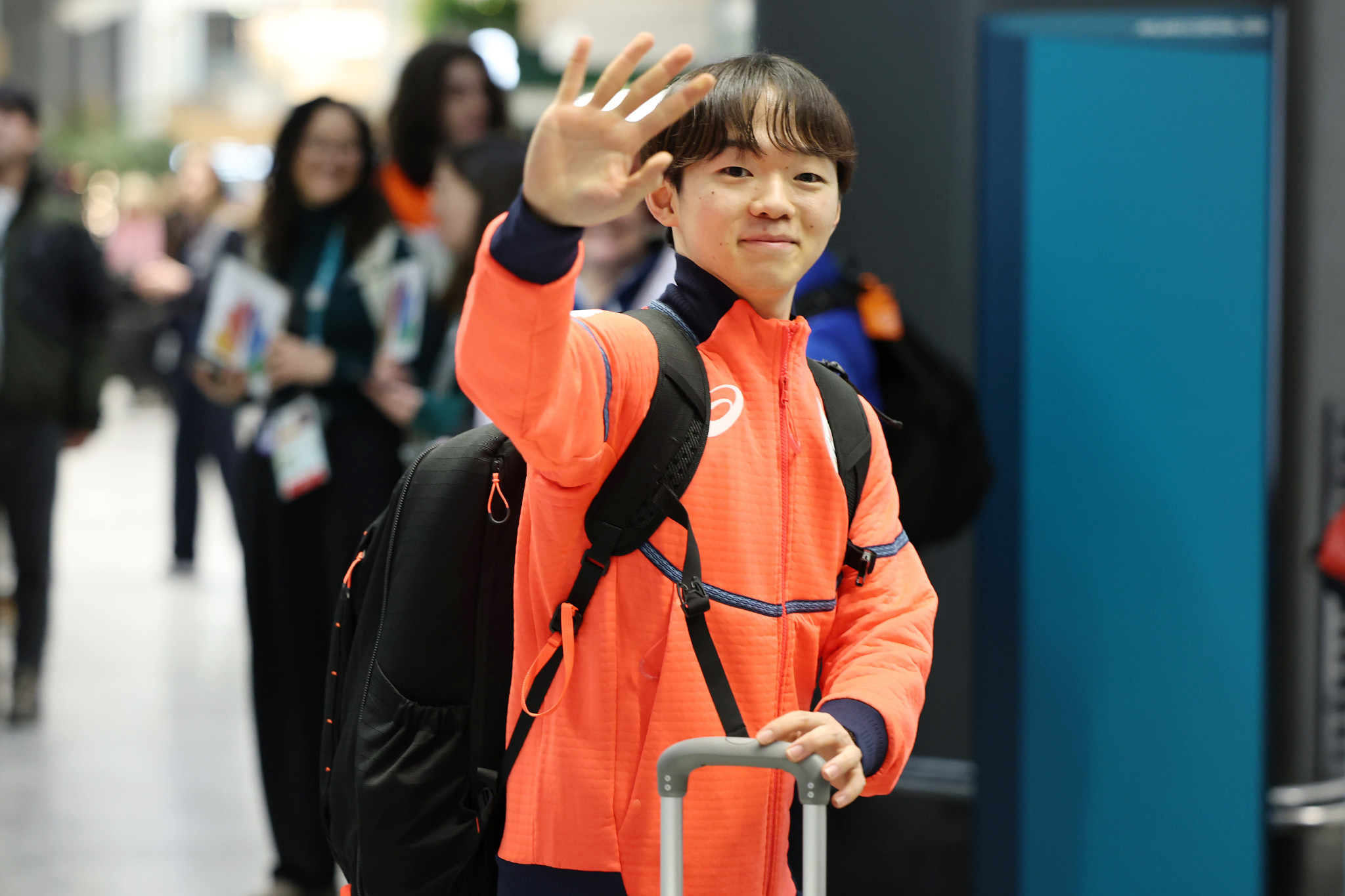 ミラノ・マルペンサ空港に到着したフィギュアスケートの鍵山優真=29日(時事)