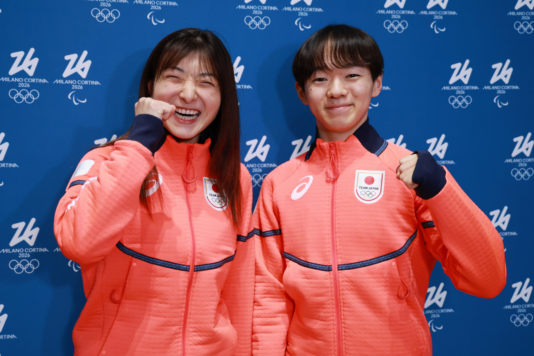 2月6日に開幕するミラノ・コルティナ五輪で、フィギュアスケート日本代表の一部選手らが29日、ミラノ・マルペンサ空港に到着した。写真は笑顔で撮影に応じる坂本花織(左)と鍵山優真。