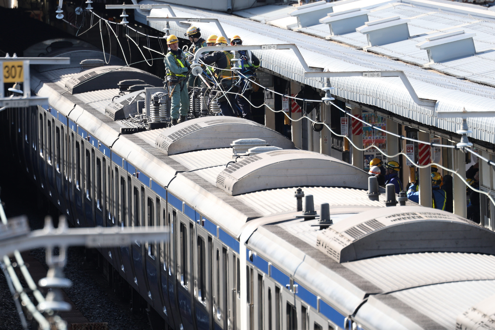 JR上野駅で架線の復旧に当たる作業員=30日午前、東京都台東区