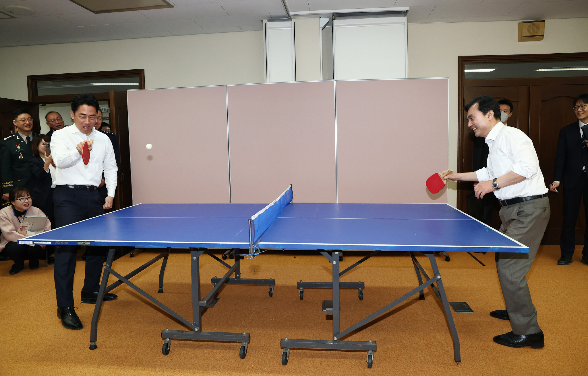 卓球で交流する日韓防衛相