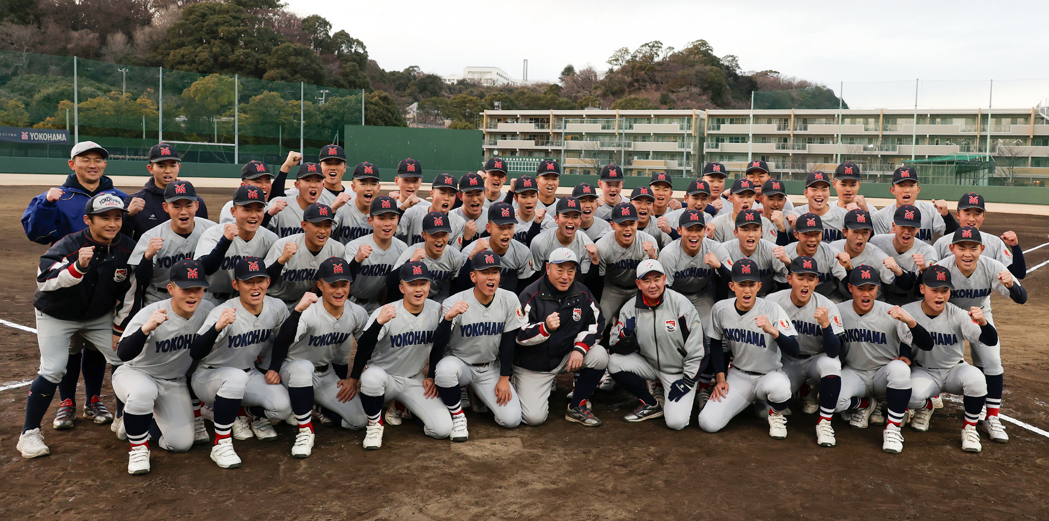選抜高校野球大会の出場が決まり、笑顔を見せる横浜の選手ら=30日、横浜市金沢区