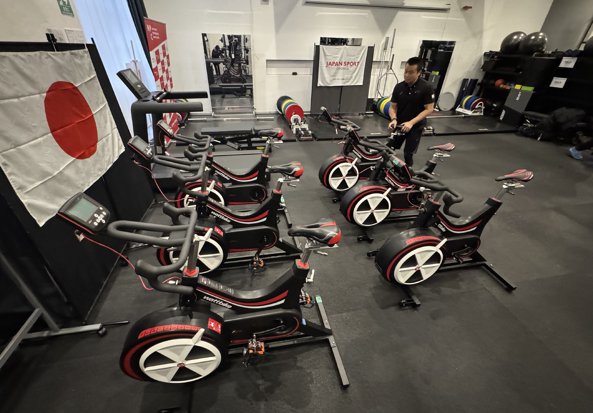 日本スポーツ振興センター(JSC)は4日、ミラノ・コルティナ五輪に参加する日本選手団を支援するミラノ市内の拠点を報道陣に公開した。写真はトレーニングエリア。
