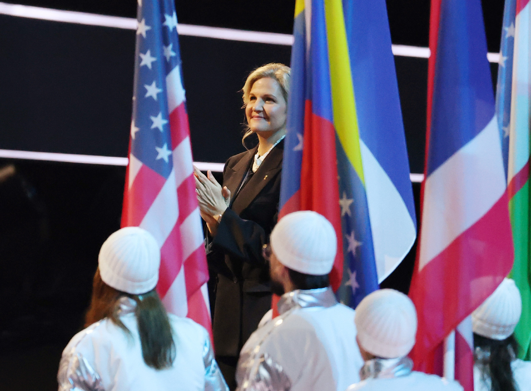 開会式に臨むIOCのコベントリー会長=6日、ミラノ