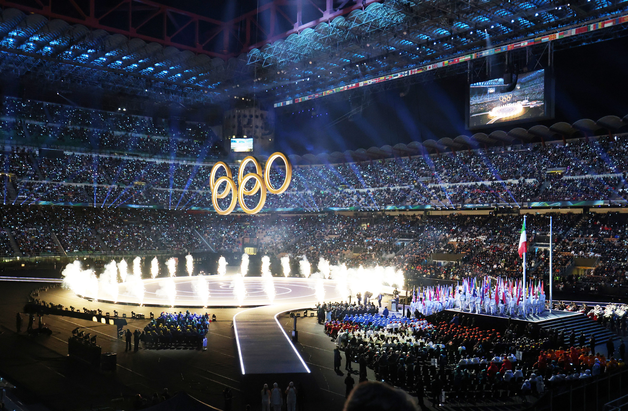 開会式会場に浮かび上がった五輪マーク=6日、ミラノ