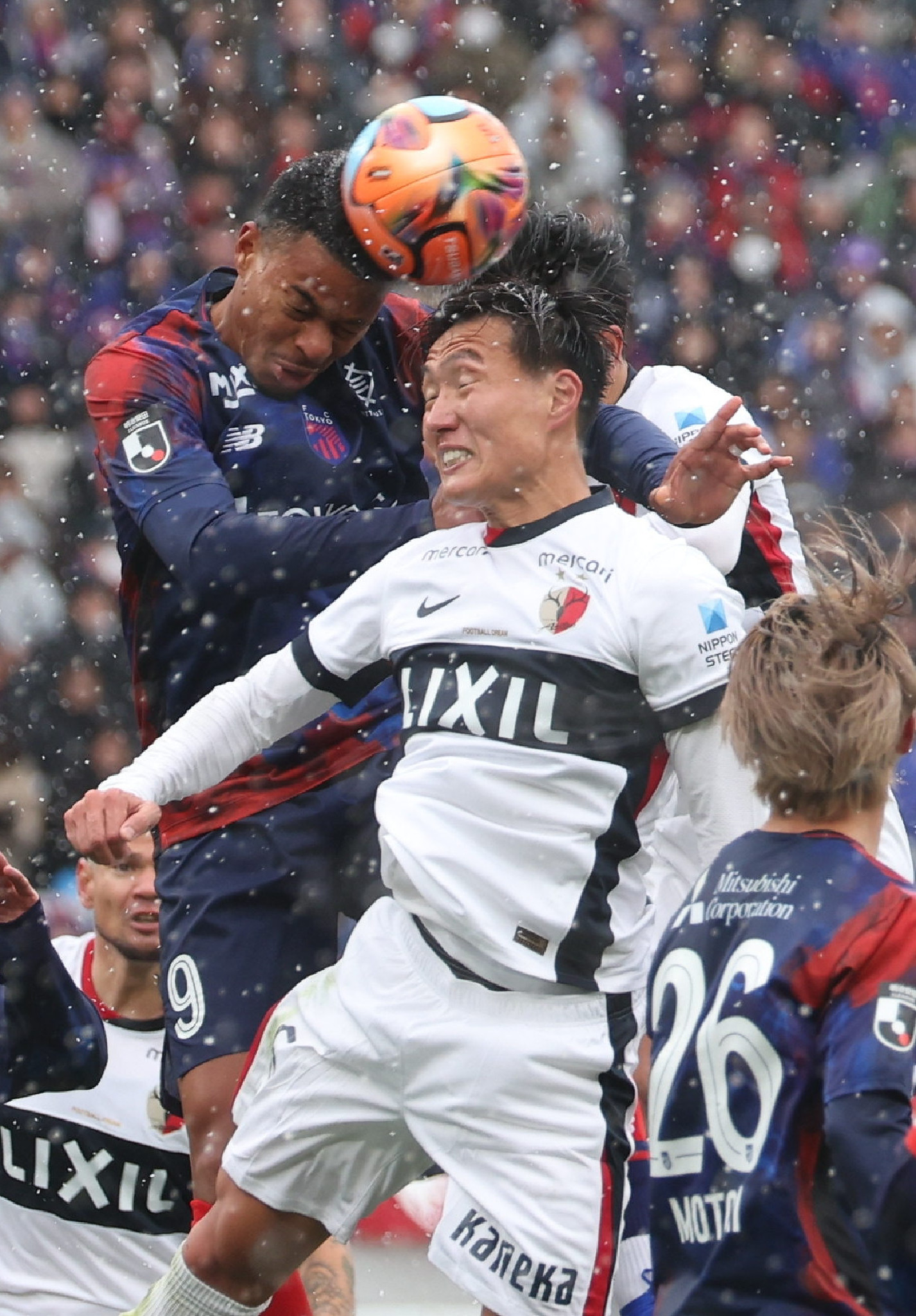 J1百年構想・F東京―鹿島。前半、ヘディングで競り合うF東京のマルセロヒアン(左)と鹿島の三竿=7日、味スタ