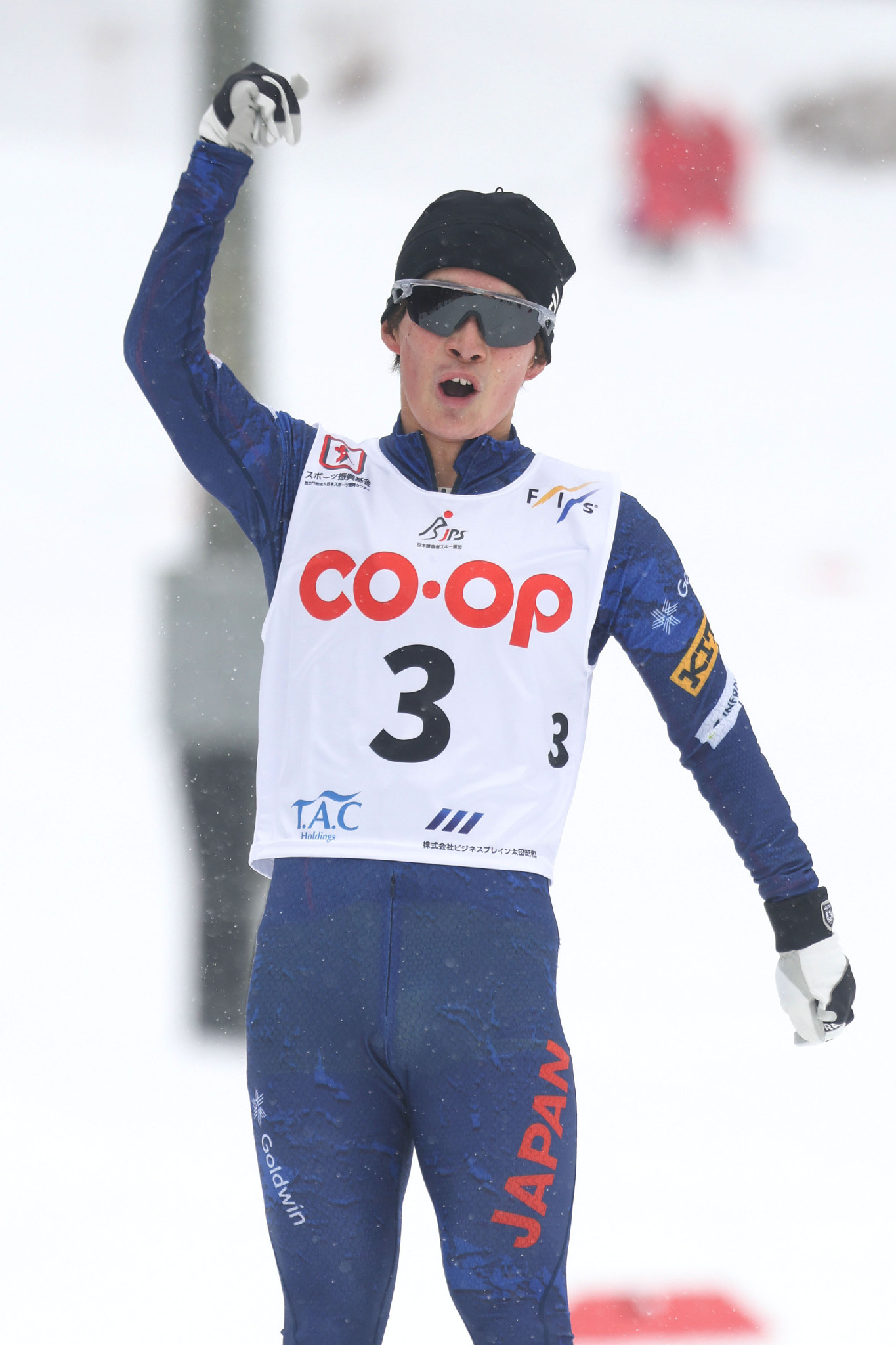 ノルディックスキー距離種目混合で行われたスプリント・クラシカルで優勝し、ガッツポーズする川除大輝=7日、白馬クロスカントリー競技場