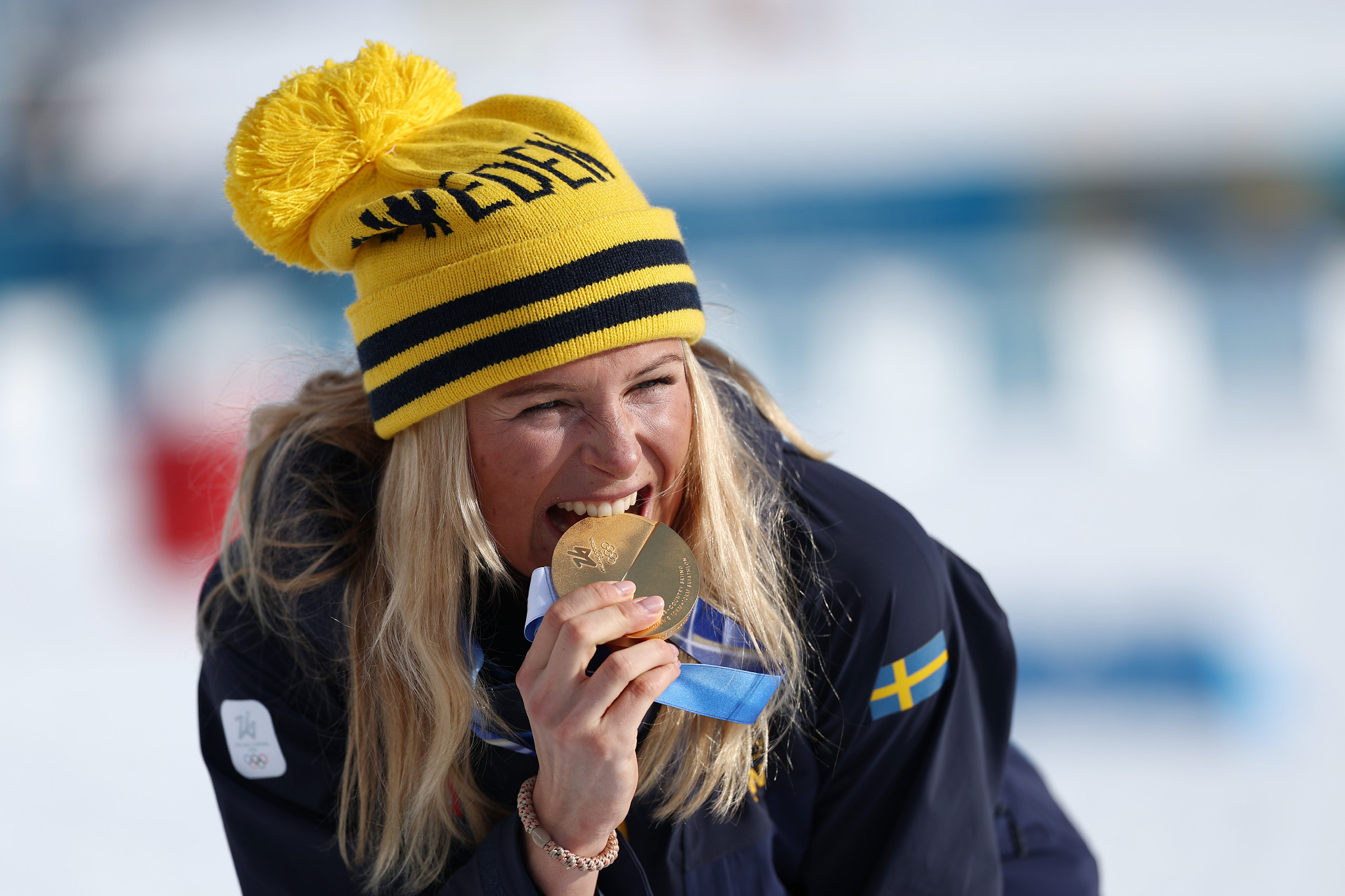 ノルディックスキー距離・女子20キロ複合で金メダルを獲得し、喜ぶスウェーデンのカールソン=7日、テーゼロ