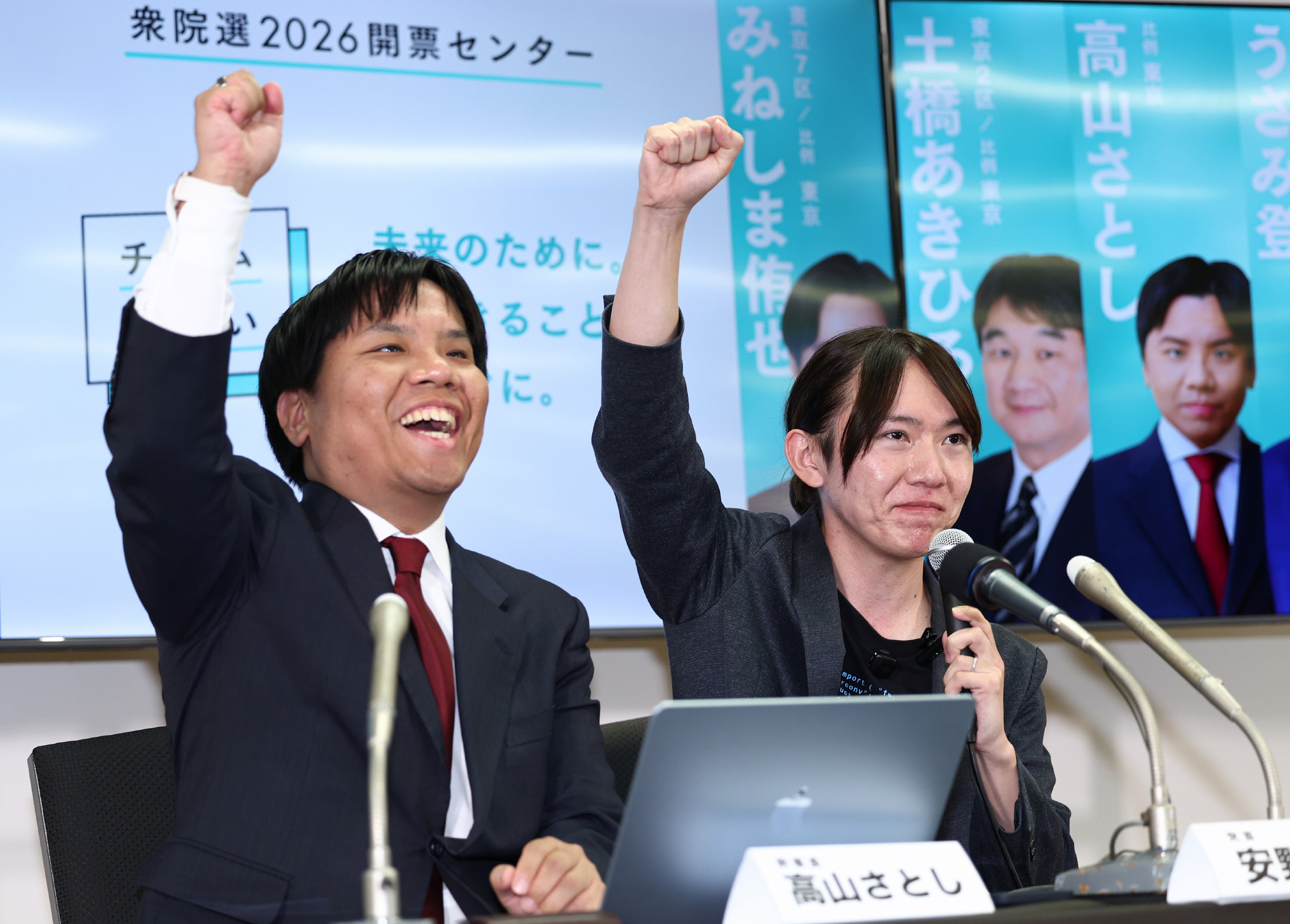 開票センターで、拳を突き上げて喜ぶチームみらいの安野貴博党首(右)と高山聡史幹事長=8日夜、東京都港区