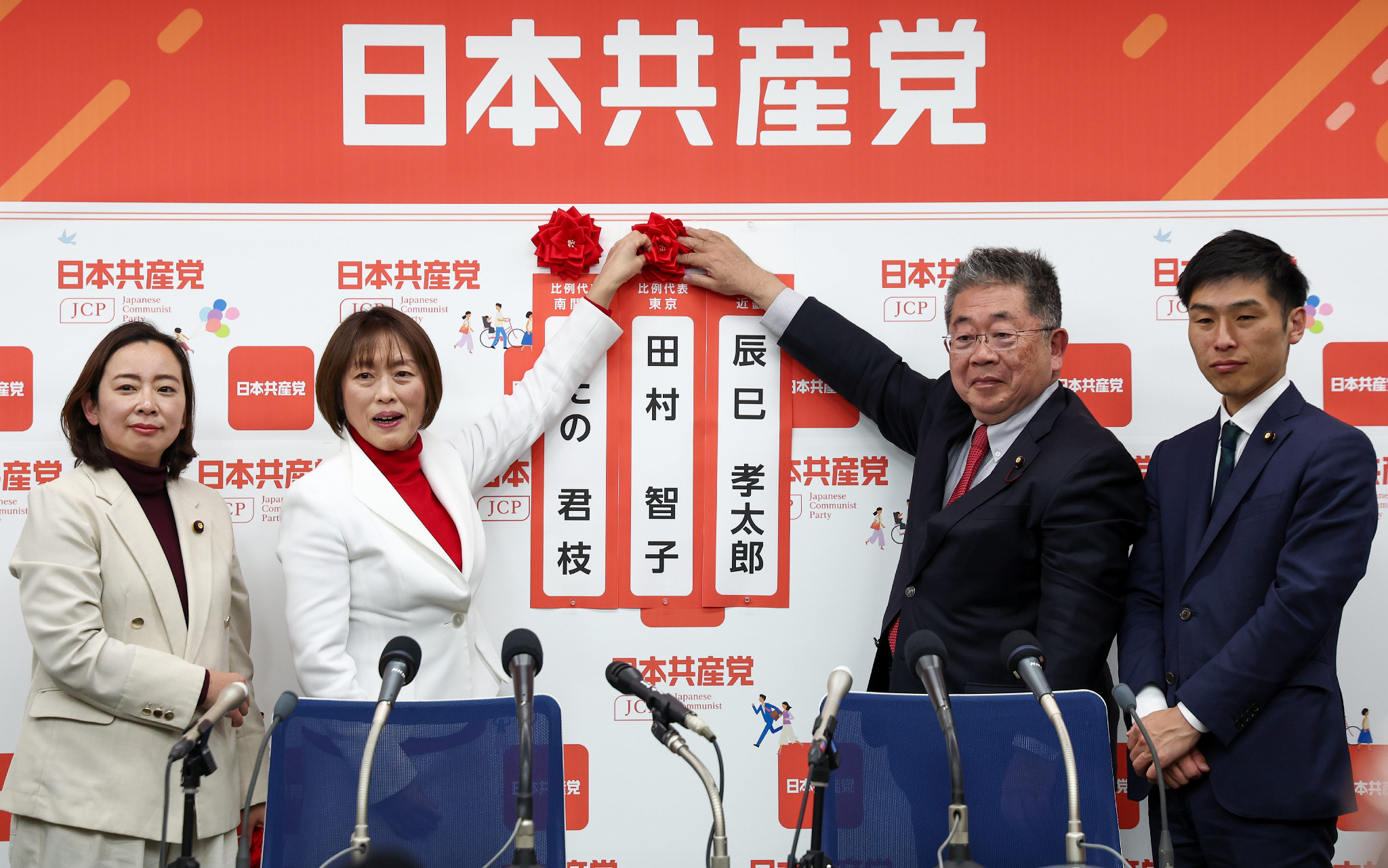 当選が確実となり、自身の名前に花を付ける共産党の田村智子委員長(中央左)=8日夜、東京都渋谷区