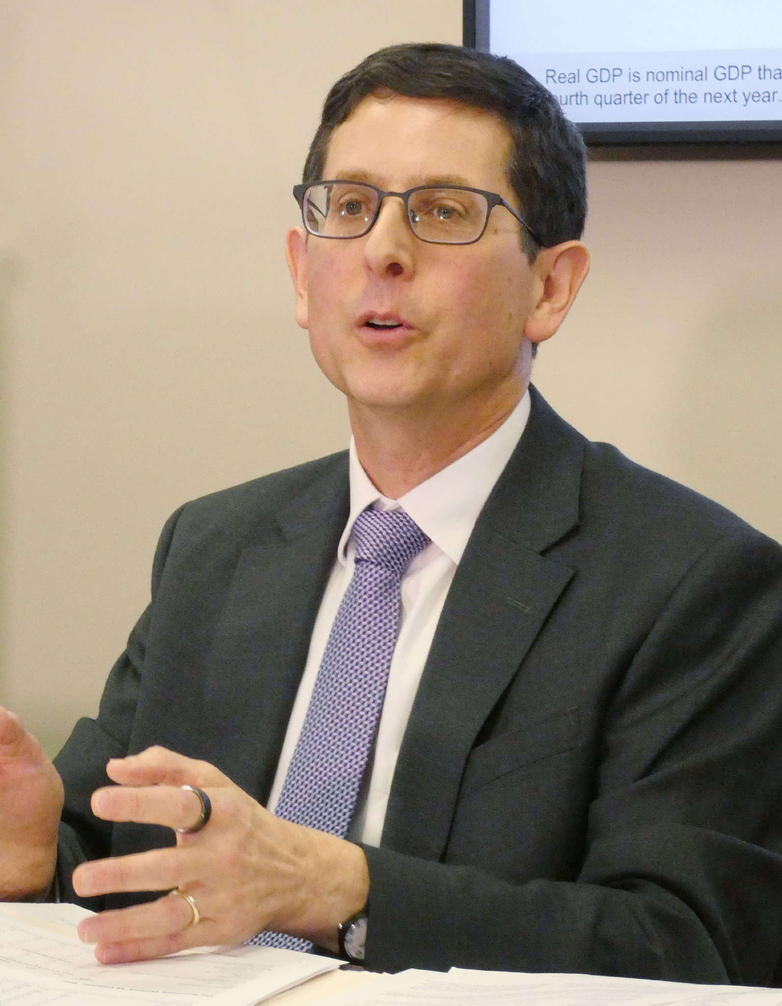 記者会見するスウェーゲル米CBO局長