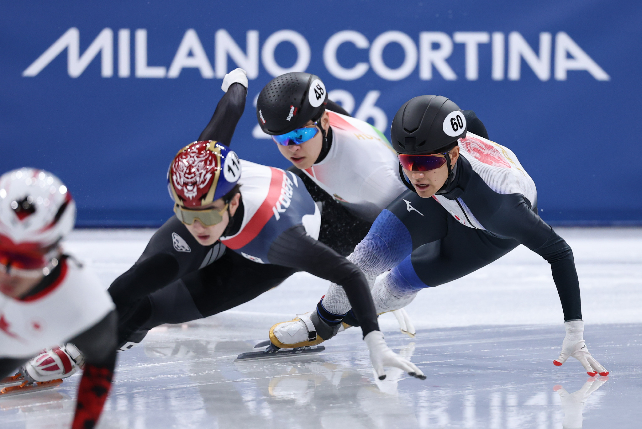スピードスケート・ショートトラック男子1000メートル準々決勝、滑走する吉永一貴(右端)。準々決勝で敗退した=12日、ミラノ郊外