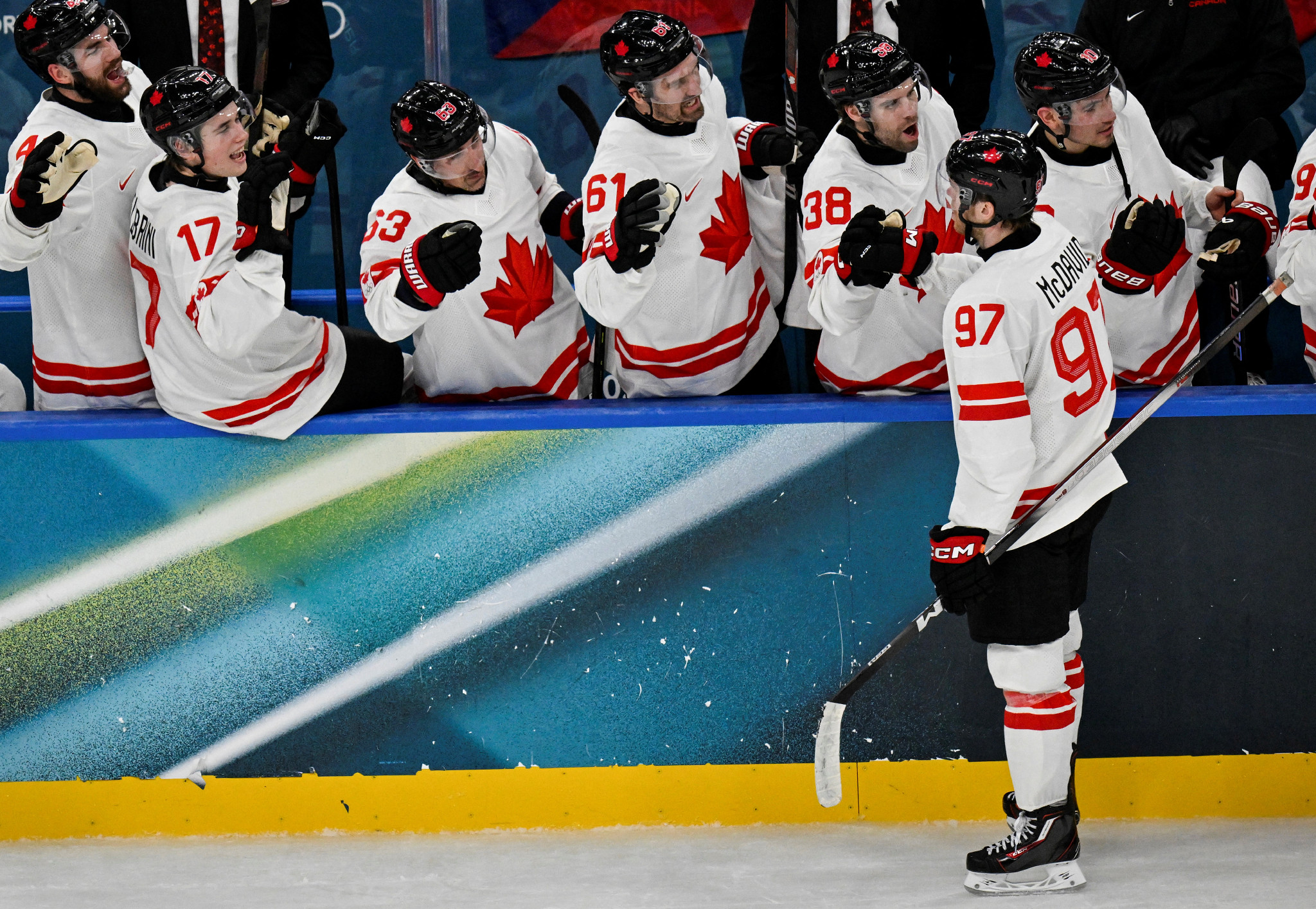 アイスホッケー男子はソチ五輪以来、3大会ぶりに北米リーグ(NHL)勢が出場。スター選手を多く擁するカナダが、初戦でチェコに5―0の快勝を収めた。写真はカナダのマクデービッド(手前)ら=12日、ミラノ【AFP時事】
