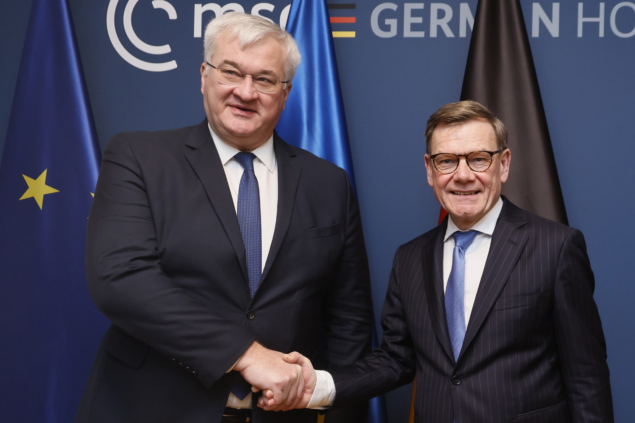 世界の首脳や国防・外交トップが集うミュンヘン安全保障会議が13日、ドイツ南部ミュンヘンで開幕した。写真は握手するドイツのワーデフール外相(右)とウクライナのシビハ外相。【EPA時事】