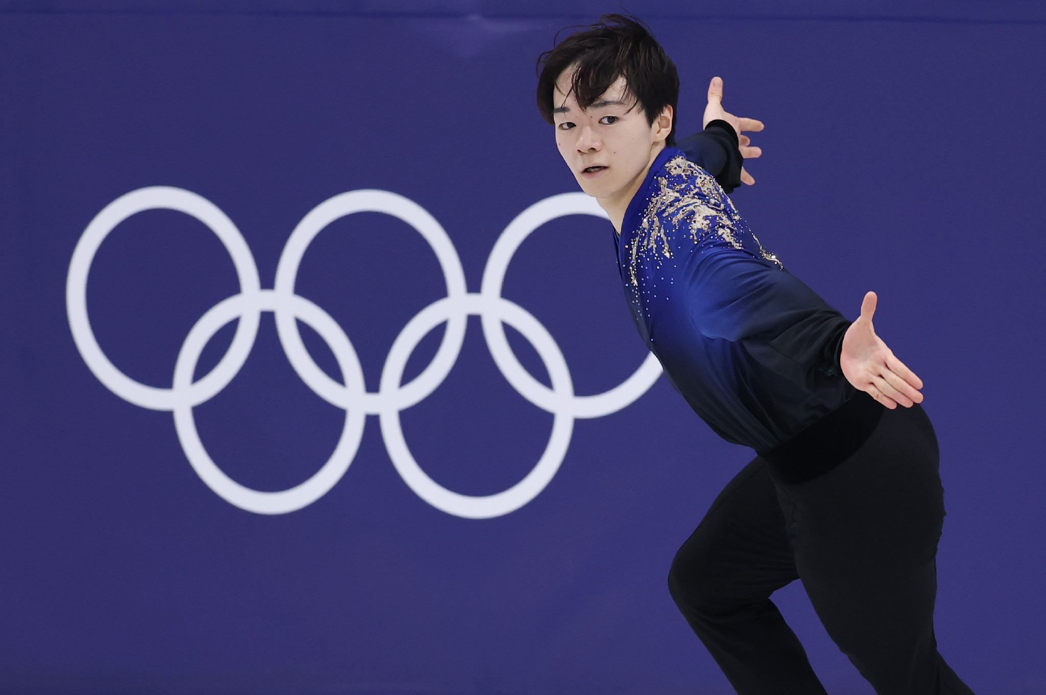 フィギュアスケート男子フリーで演技する鍵山優真。2大会連続の銀を獲得した=13日、ミラノ郊外