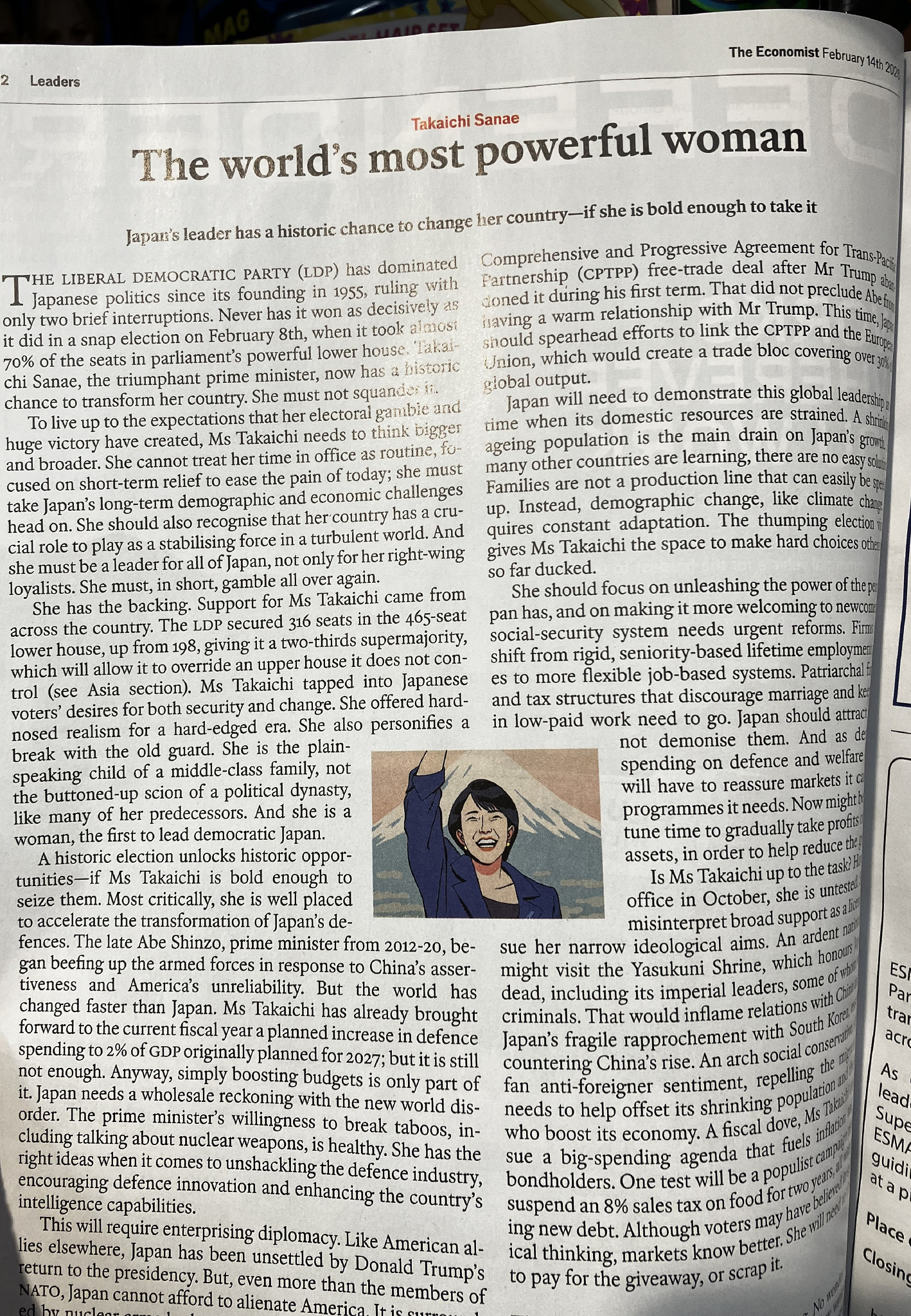 英誌エコノミスト最新号(14~20日)は、高市早苗首相を「世界で最も強力な女性」と紹介する特集記事を掲載した=13日、ロンドン