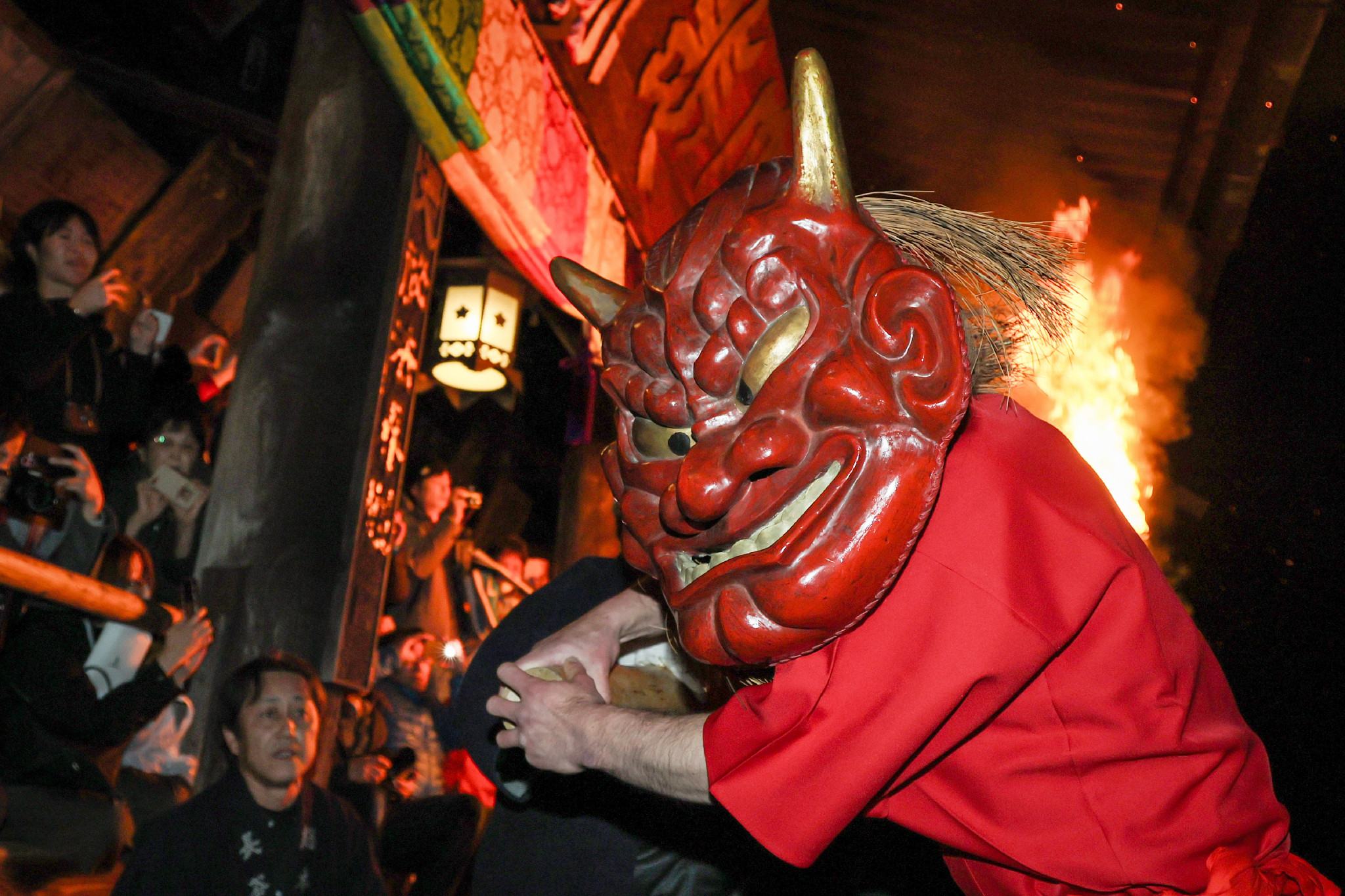 奈良県桜井市の長谷寺で14日、大和路に春を呼ぶ火祭り「だだおし」が行われた。ほら貝や太鼓の音とともに鬼たちが大声を上げながら本堂に登場すると、お札を手にした僧侶たちが追い出した。