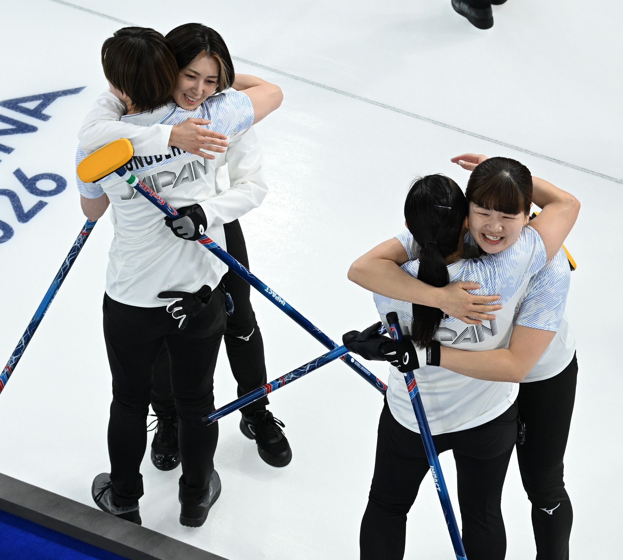 ミラノ・コルティナ五輪第9日は14日、カーリング女子の1次リーグ第3戦でフォルティウスの日本がスイスに7―5で勝って初白星を挙げ、1勝2敗とした。写真は喜ぶ日本チーム=コルティナダンペッツォ
