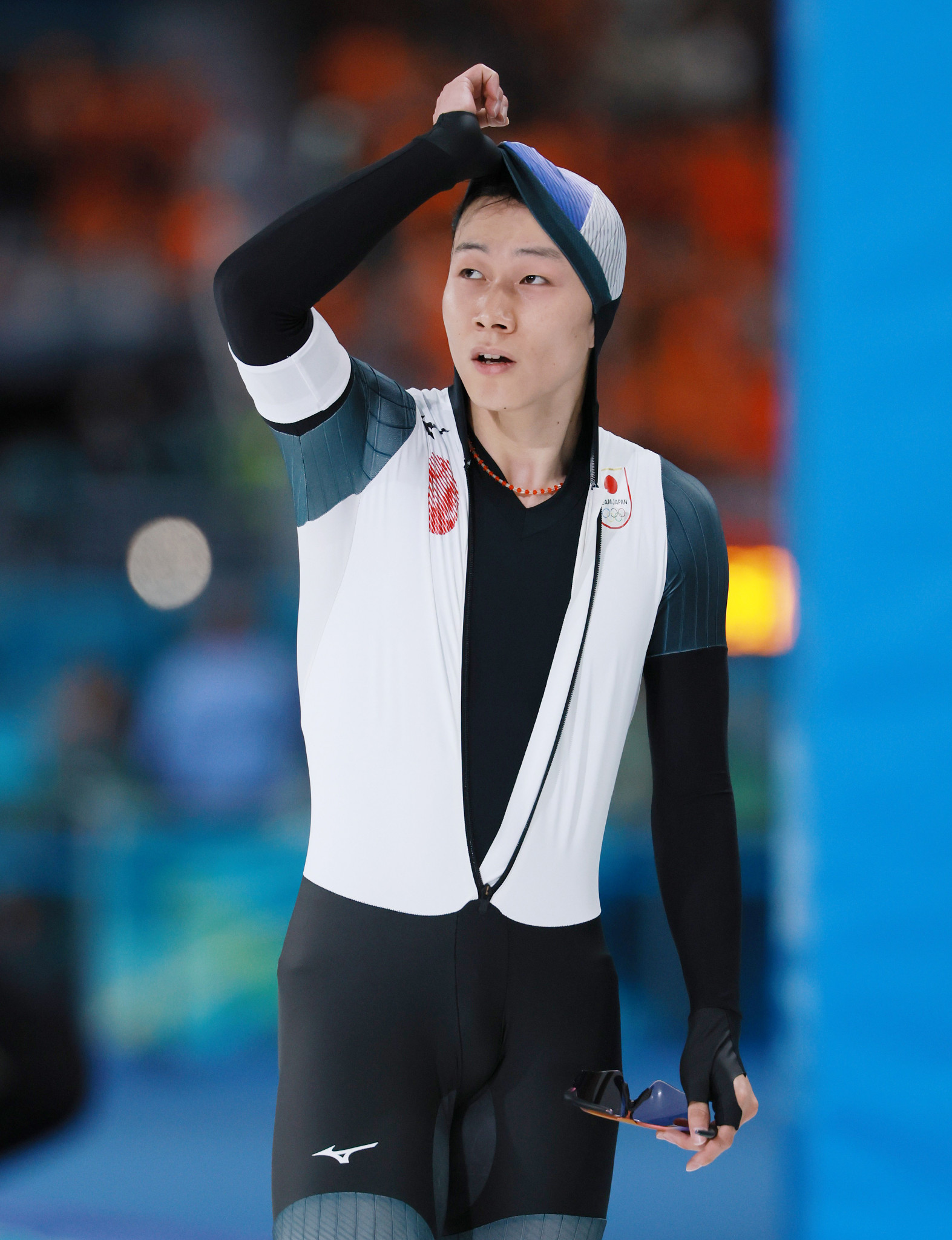 スピードスケート男子500メートル、滑走を終えた森重航=14日、ミラノ郊外