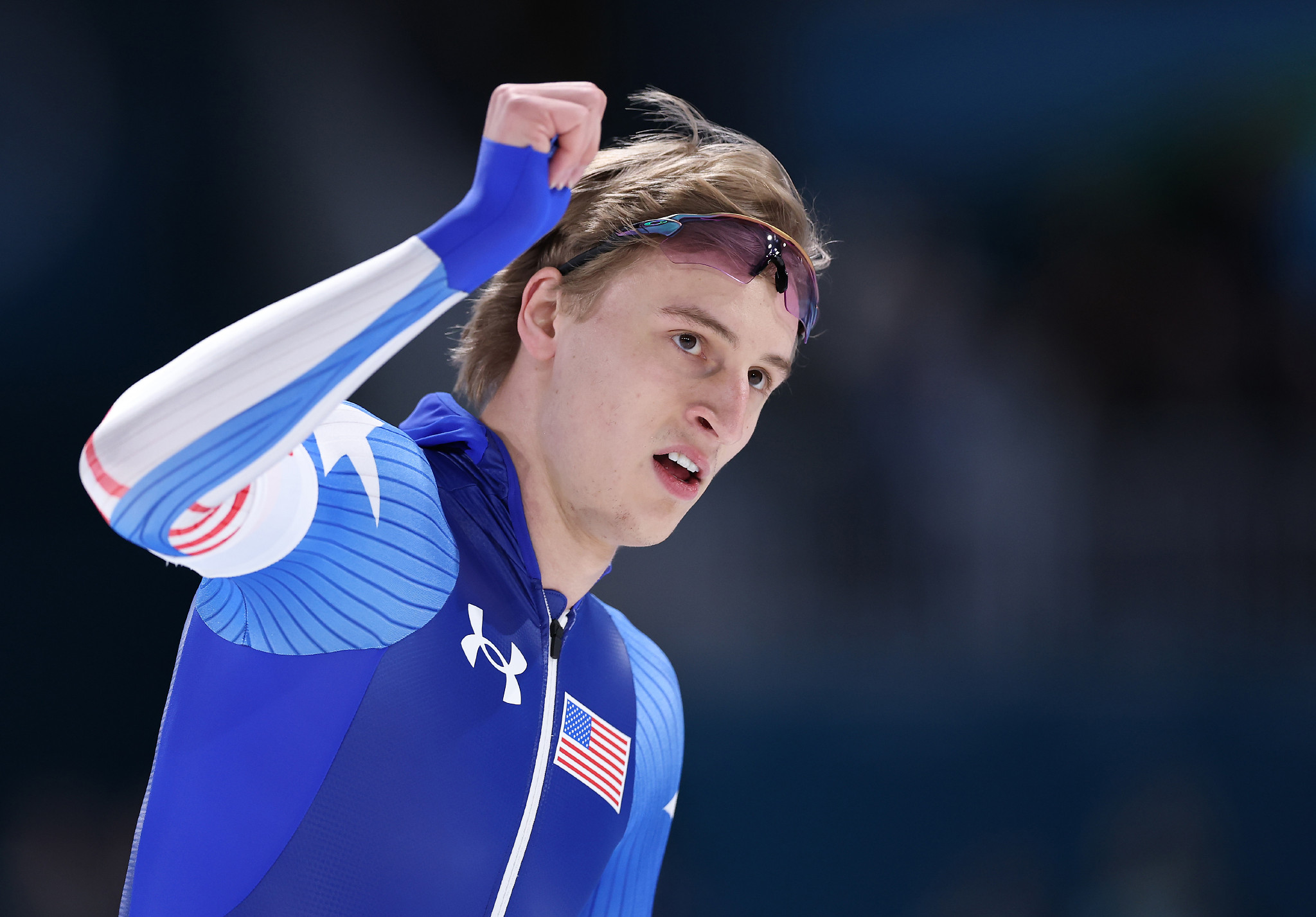 スピードスケート男子500メートル、滑走を終えガッツポーズする米国のストルツ=14日、ミラノ郊外