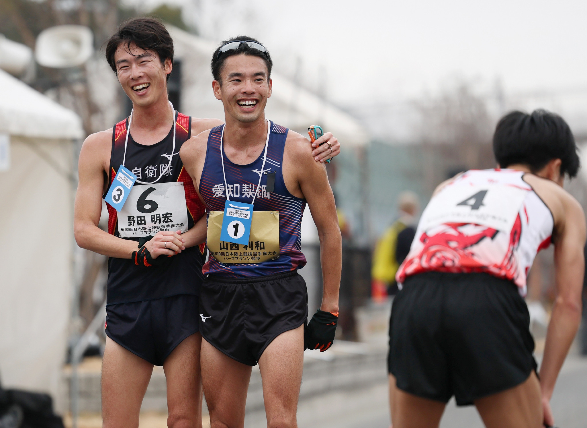 陸上の日本選手権ハーフマラソン競歩。男子で世界記録を樹立して優勝し、笑顔を見せる山西利和(中央)=15日、神戸市