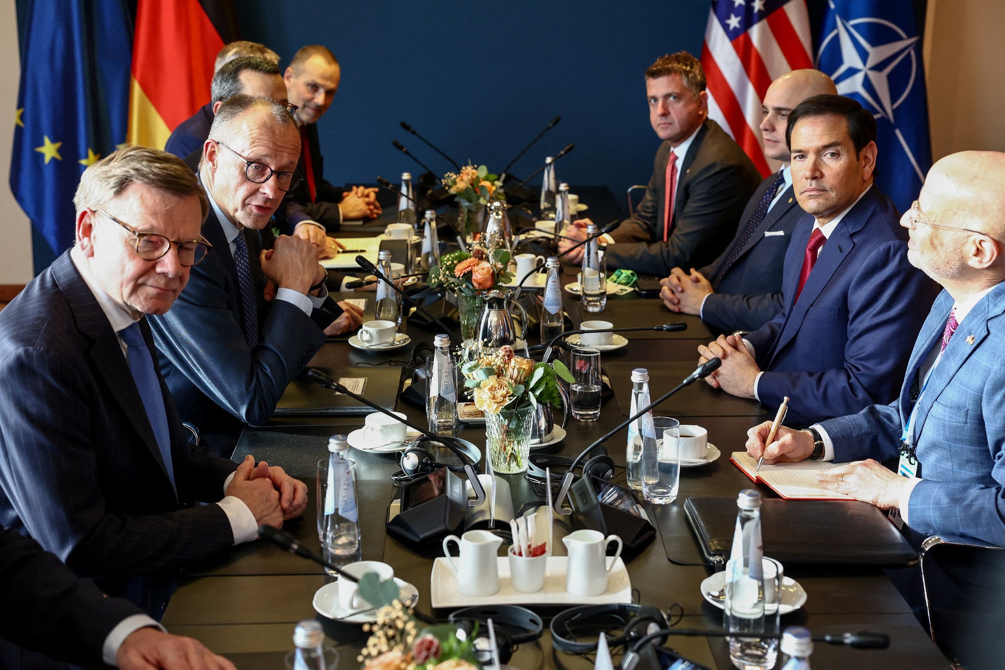 ドイツ南部で開かれていたミュンヘン安全保障会議が15日、閉幕した。写真は、ドイツのメルツ首相(左から2人目)と会談するルビオ米国務長官(右から2人目)=13日撮影【AFP時事】