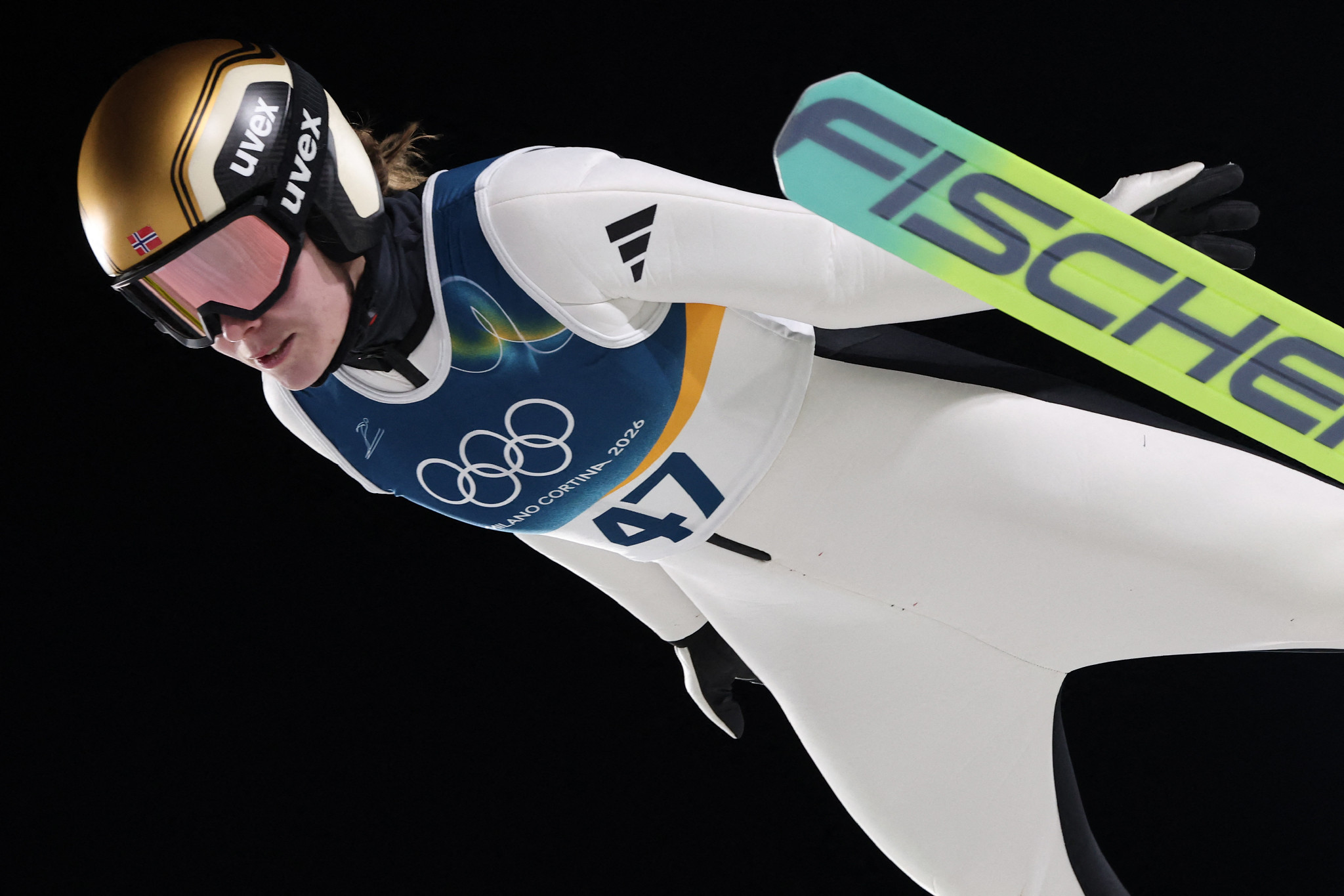 ノルディックスキー・ジャンプ女子個人ラージヒル、金メダルを獲得したノルウェーのストロムの飛躍=15日、プレダッツォ