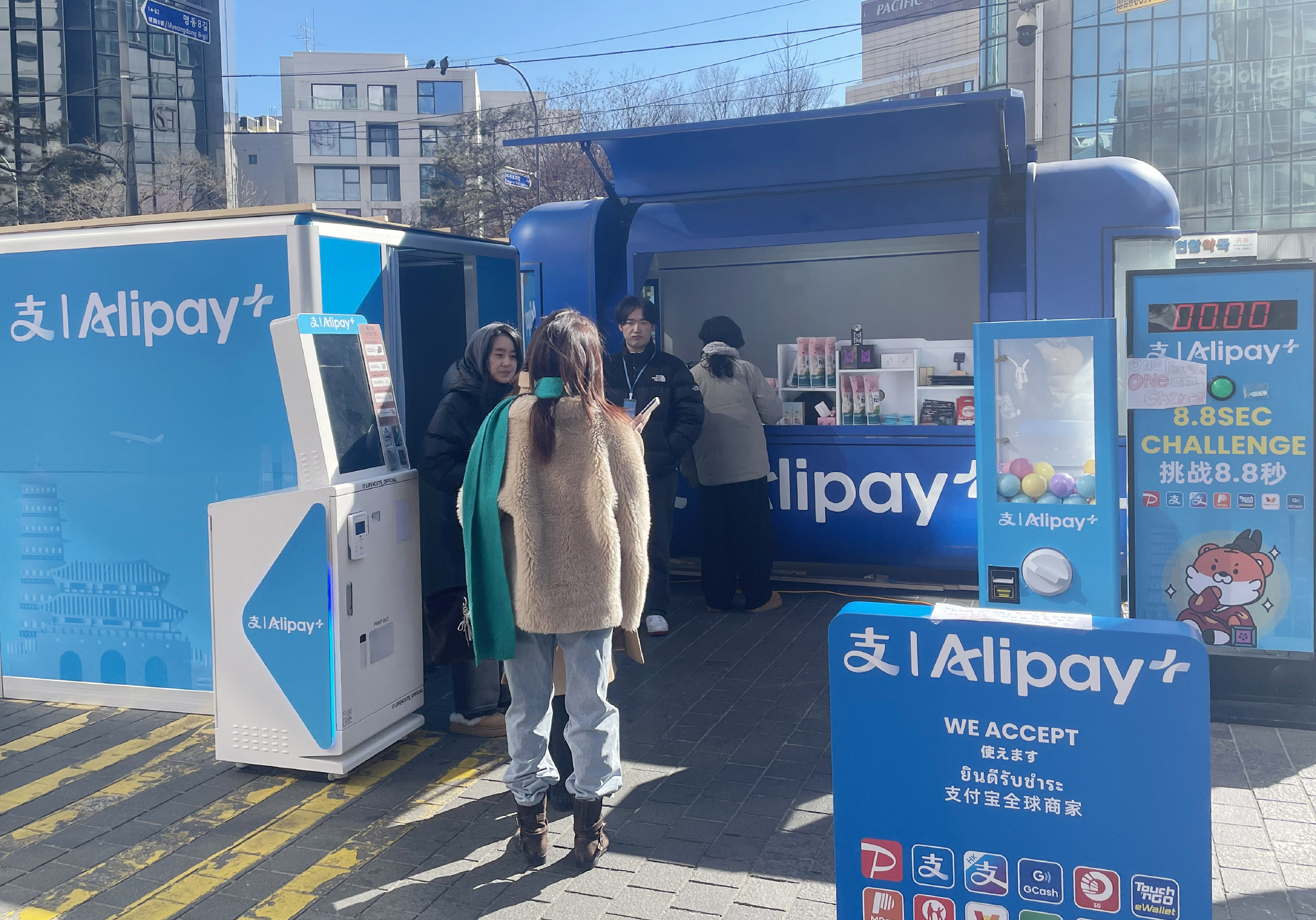 中国人の春節(旧正月)休暇の旅行先として韓国が人気を集めている。写真は、ソウルの繁華街・明洞に設置された中国の電子決済サービス推進のためのブース=17日