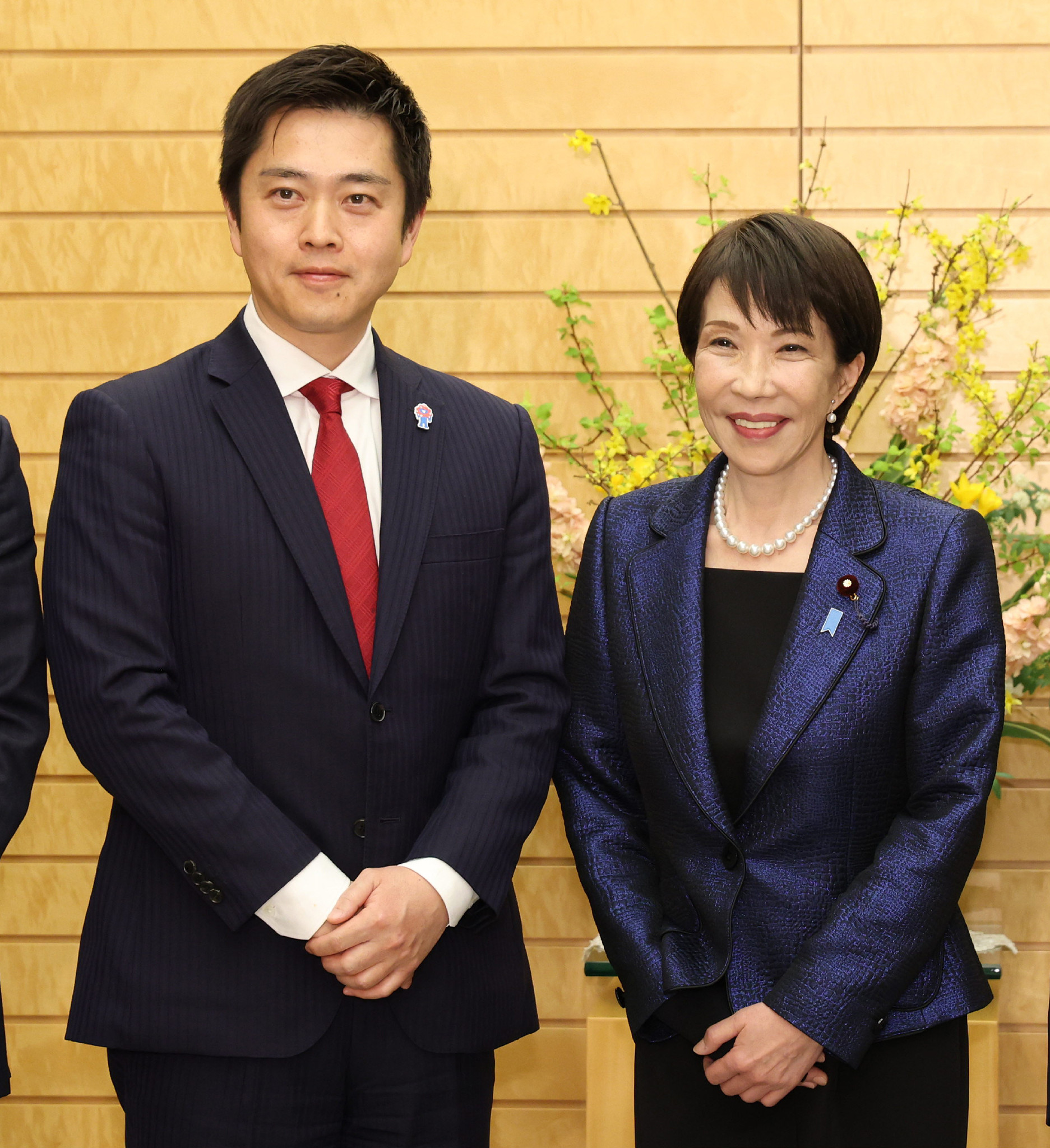 与党党首会談に臨む日本維新の会の吉村洋文代表(左)と高市早苗首相=18日午後、東京・永田町