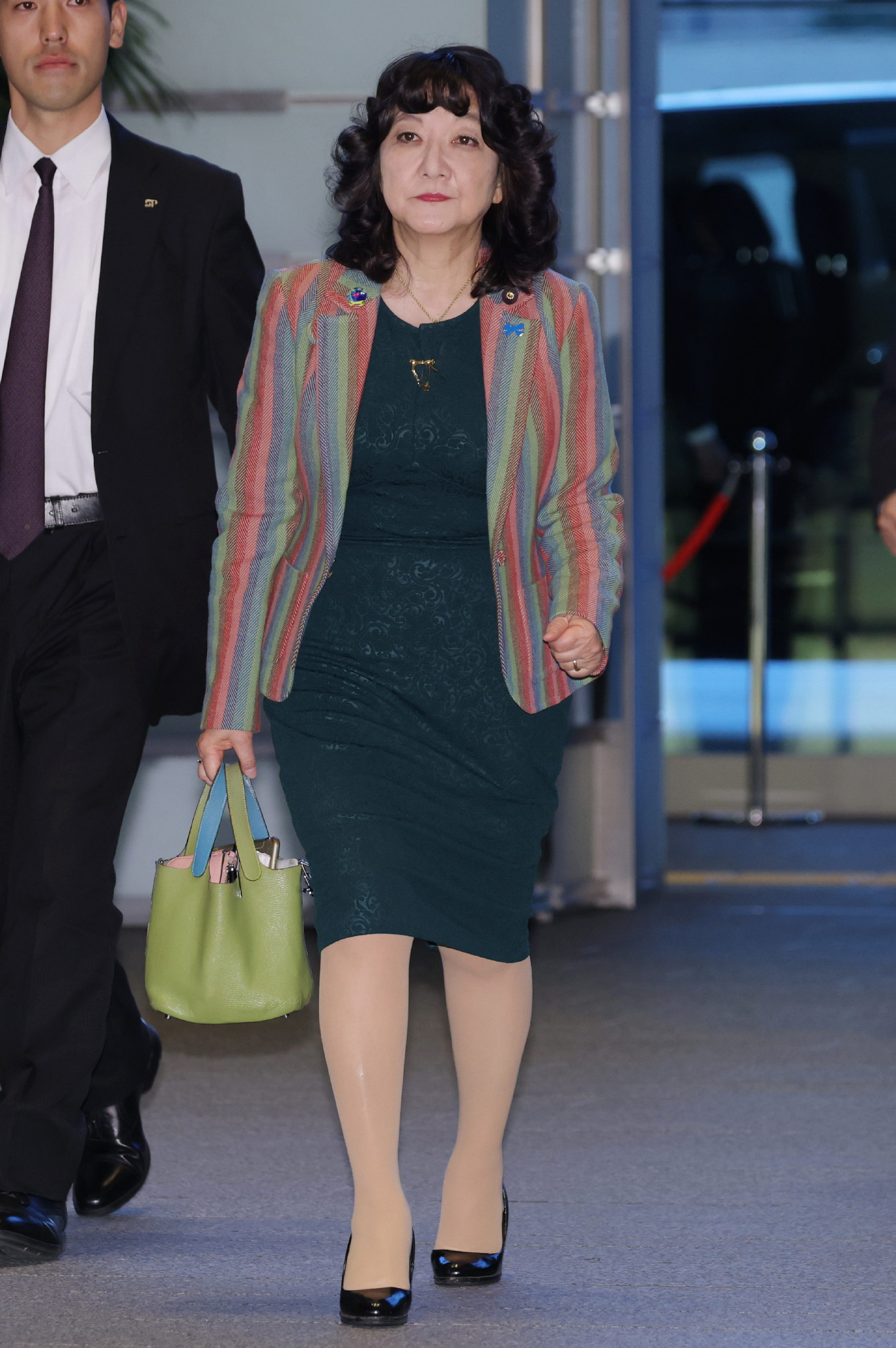 財務相再任が決まり、首相官邸に入る片山さつき氏=18日午後、東京・永田町
