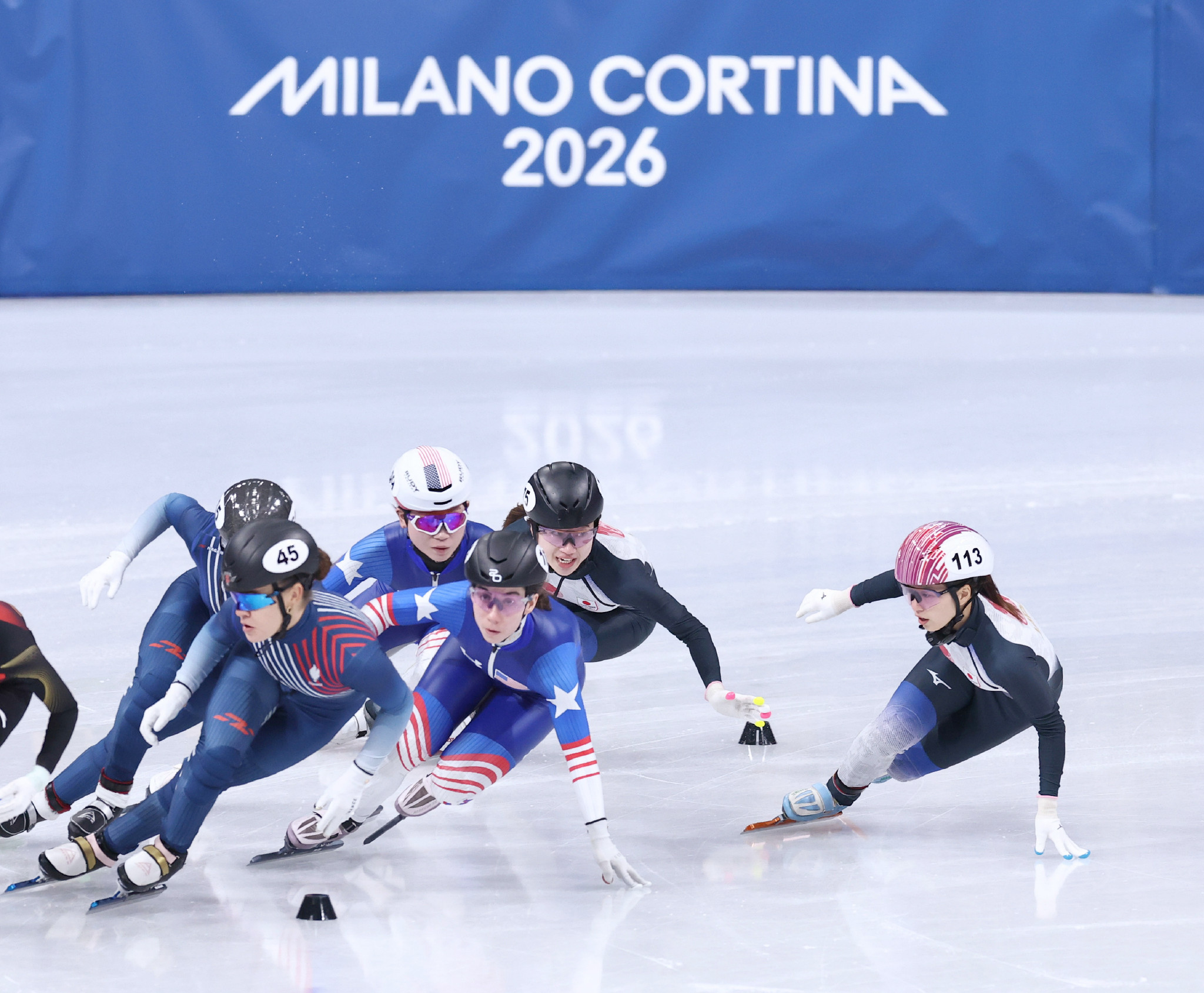 スピードスケート・ショートトラック女子3000メートルリレー順位決定戦で滑走する長森(右端)と渡辺(同2人目)。日本は2着となり、6位=18日、ミラノ郊外