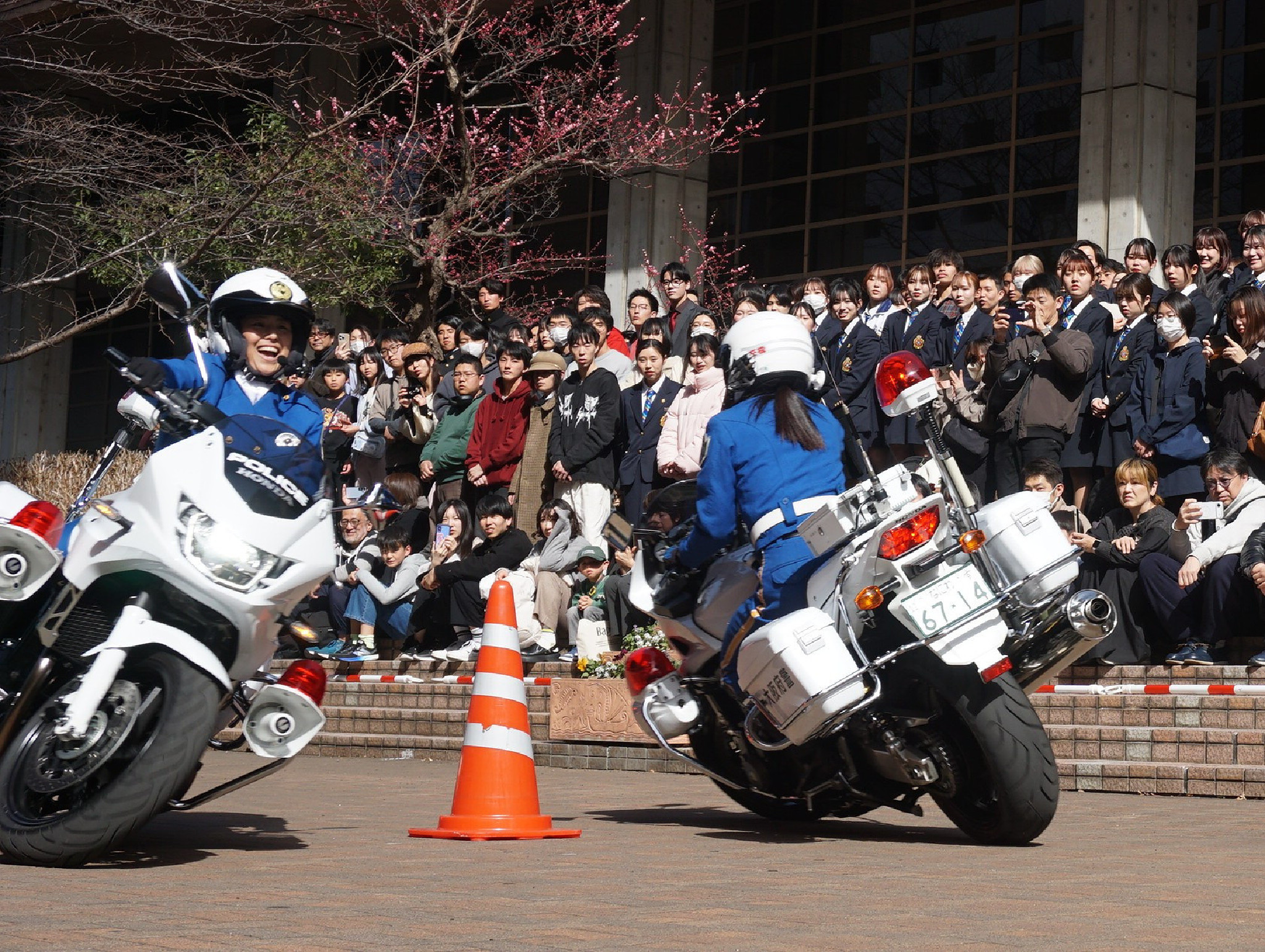 大阪府警は23日、近畿大東大阪キャンパスで広報イベントを初開催。白バイ隊によるバイク走行の実演や音楽隊による演奏などを通して仕事の魅力をPRしたほか、交通安全教室を開きルールの順守を呼び掛けた。