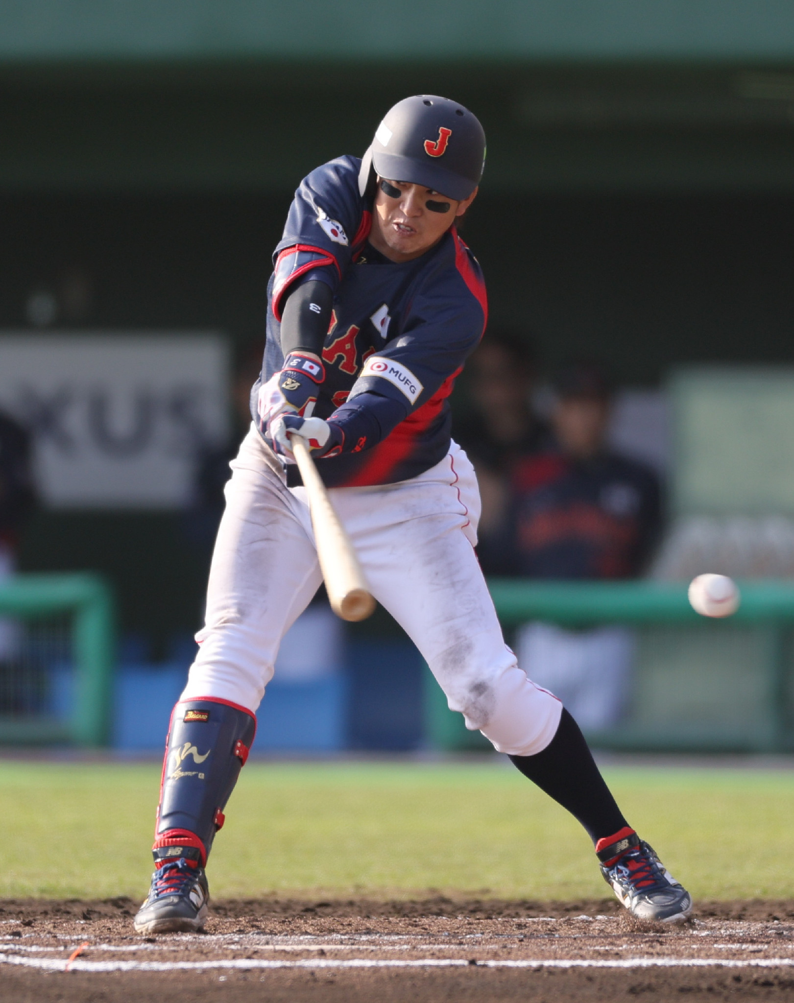 野球の国・地域別対抗戦ワールド・ベースボール・クラシック(WBC)に出場する日本代表「侍ジャパン」壮行試合第2戦。ソフトバンク戦の7回、空振り三振に倒れる小園=23日、宮崎市