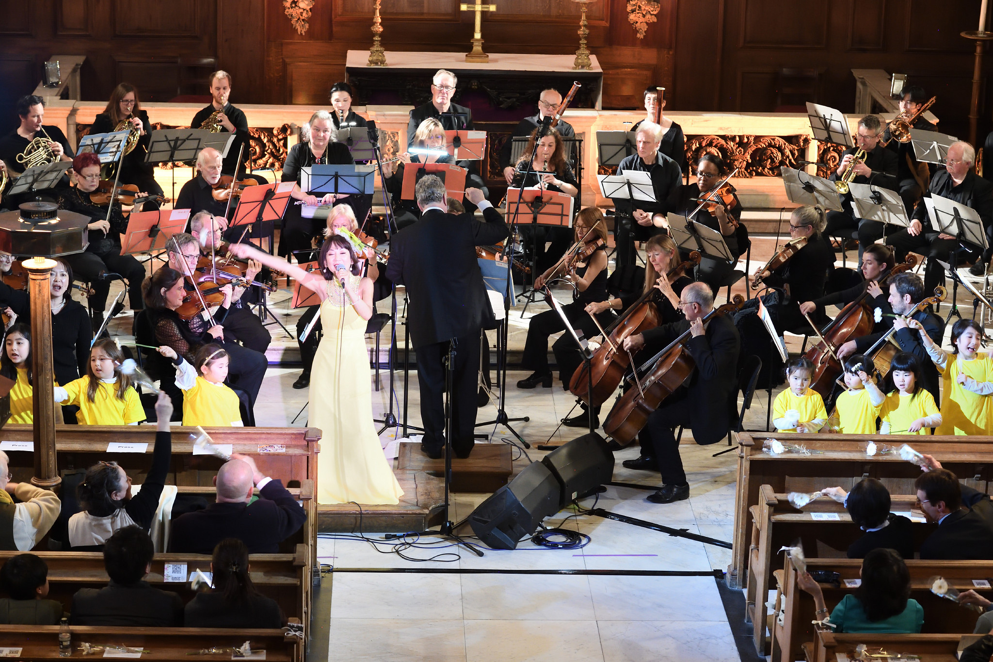コンサートで歌う鈴木ナオミさん(中央左)。東日本大震災が発生から15年を迎えるのを前に、ロンドン市内の教会で6日、在英邦人らによる追悼コンサート「希望の響き3.11がつなぐ世界の祈り」が開かれた。