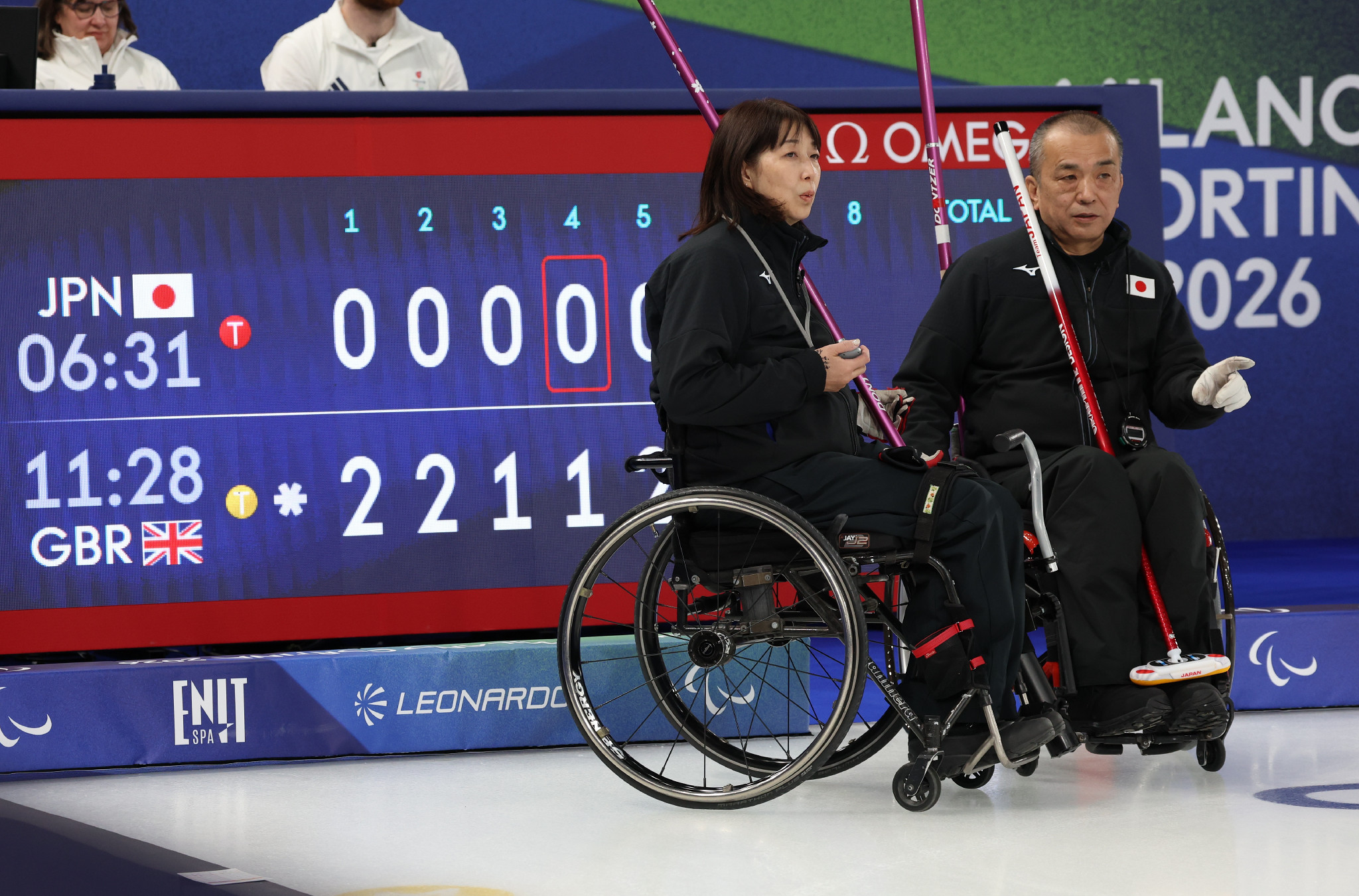 ミラノ・コルティナ・パラリンピック。車いすカーリング混合ダブルス1次リーグの英国戦、作戦を練る小川亜希(左)、中島洋治組。2―11で大敗し、通算2勝3敗となった=7日、コルティナダンペッツォ