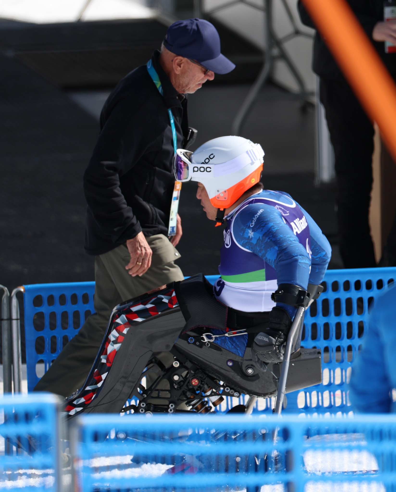 ミラノ・コルティナ・パラリンピック。アルペンスキー男子滑降座位、途中棄権になった森井大輝=7日、コルティナダンペッツォ
