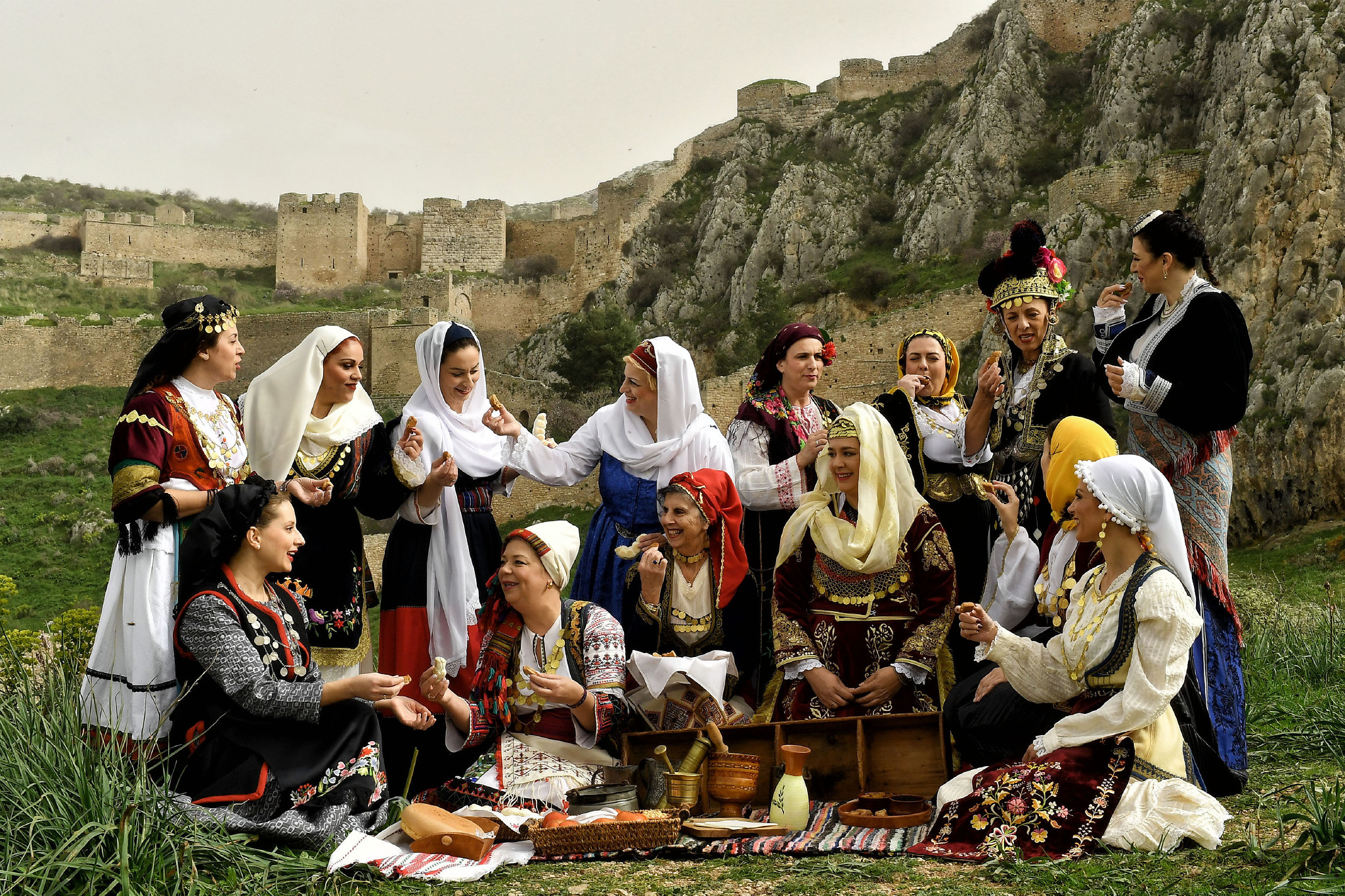 8日、ギリシャ南部ペロポネソス半島の入り口、コリントスで、鮮やかな民族衣装をまとった女性たち。国際女性デーに合わせ、各地の女性の伝統衣装の美しさを披露した。【EPA時事】