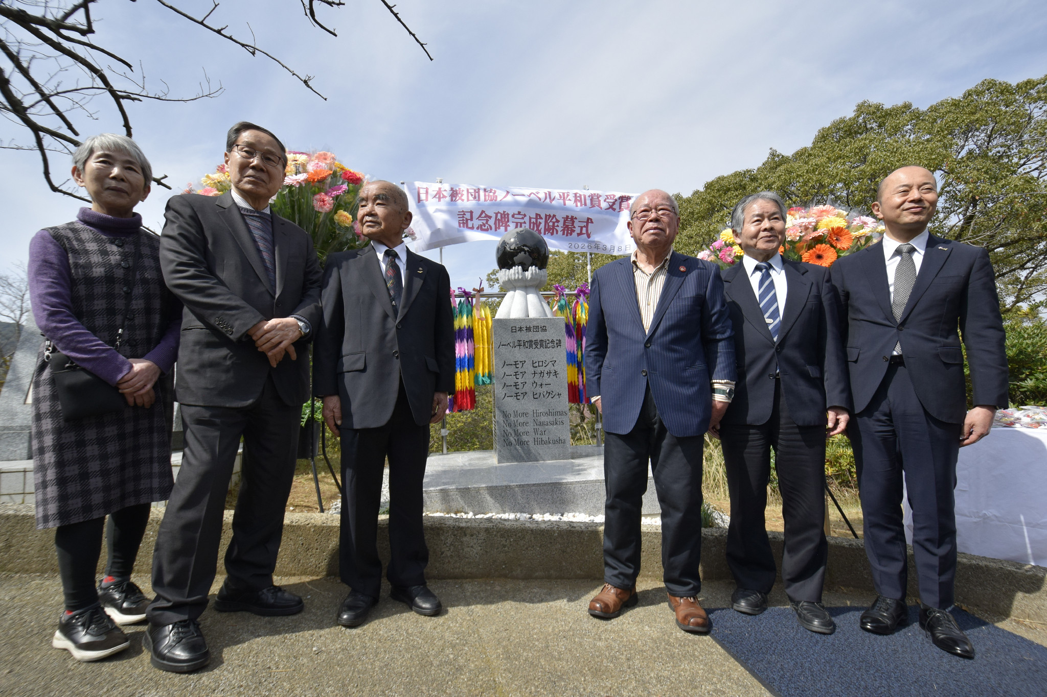 長崎原爆被災者協議会(長崎被災協)をはじめとする被爆者4団体などは、日本原水爆被害者団体協議会(日本被団協)による2024年のノーベル平和賞受賞を記念する石碑の除幕式を長崎市内で開いた=8日