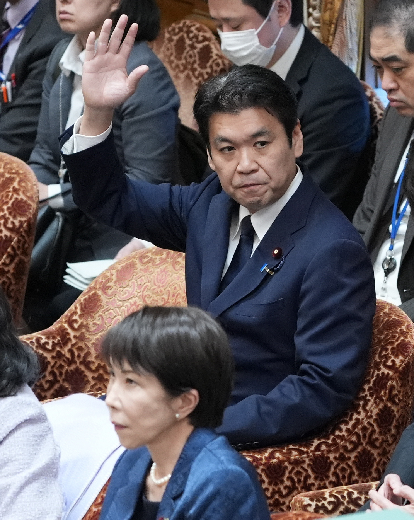 衆院予算委員会で挙手する松本洋平文部科学相(奥)。手前は高市早苗首相=12日、国会内