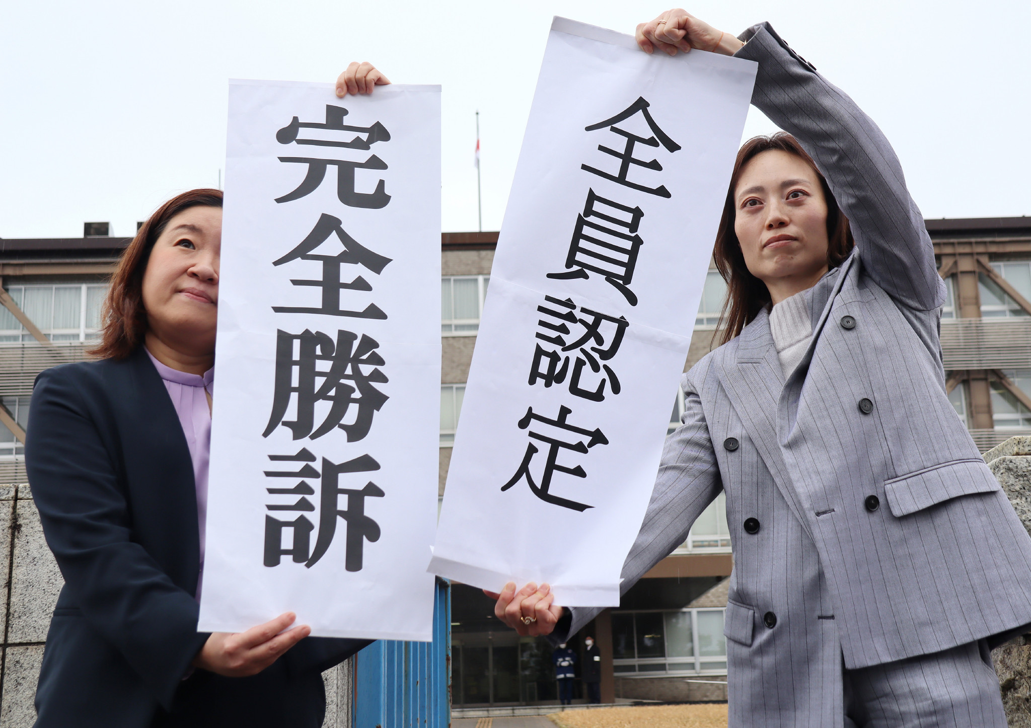 新潟水俣病の行政認定を求めた訴訟の判決を受け、「完全勝訴」などと書かれた紙を掲げる弁護団=12日午後、新潟市中央区