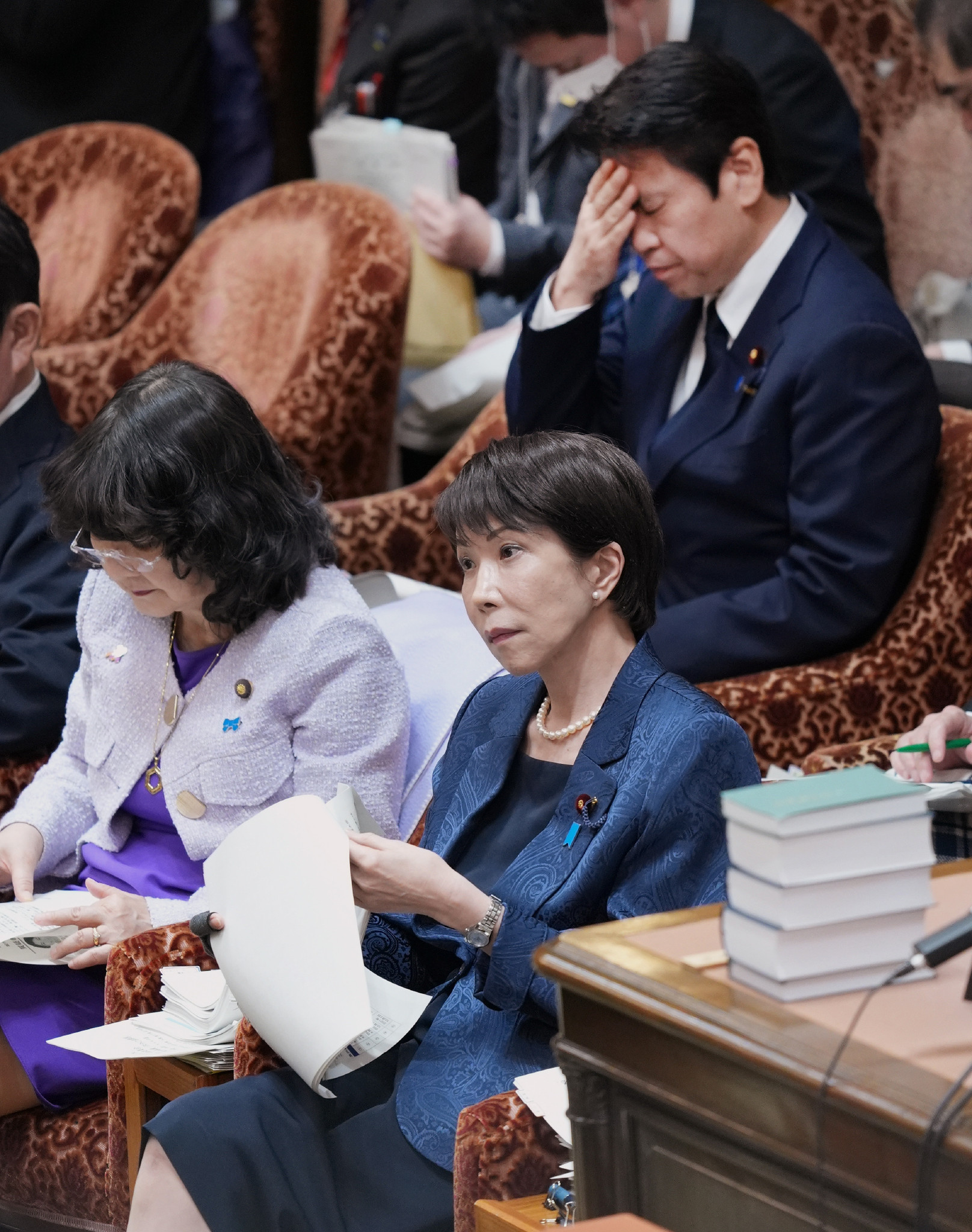 衆院予算委員会で質問を聞く高市早苗首相(手前右)。右奥は松本洋平文部科学相=12日、国会内
