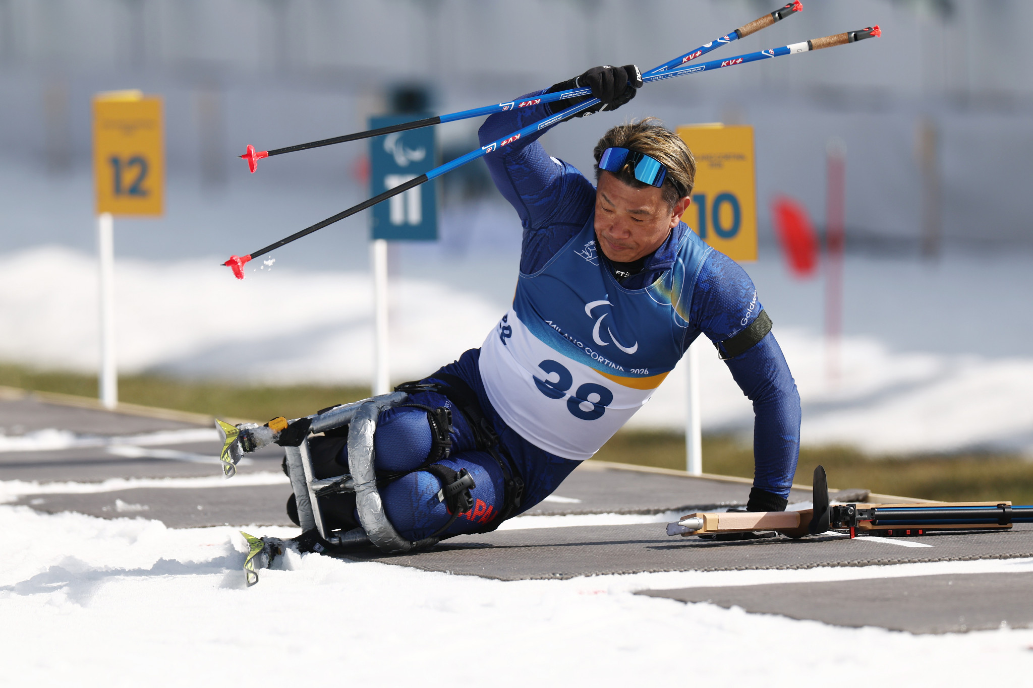 ミラノ・コルティナ・パラリンピック。バイアスロン男子スプリント追い抜き座位決勝、射撃を終えた源貴晴=13日、テーゼロ