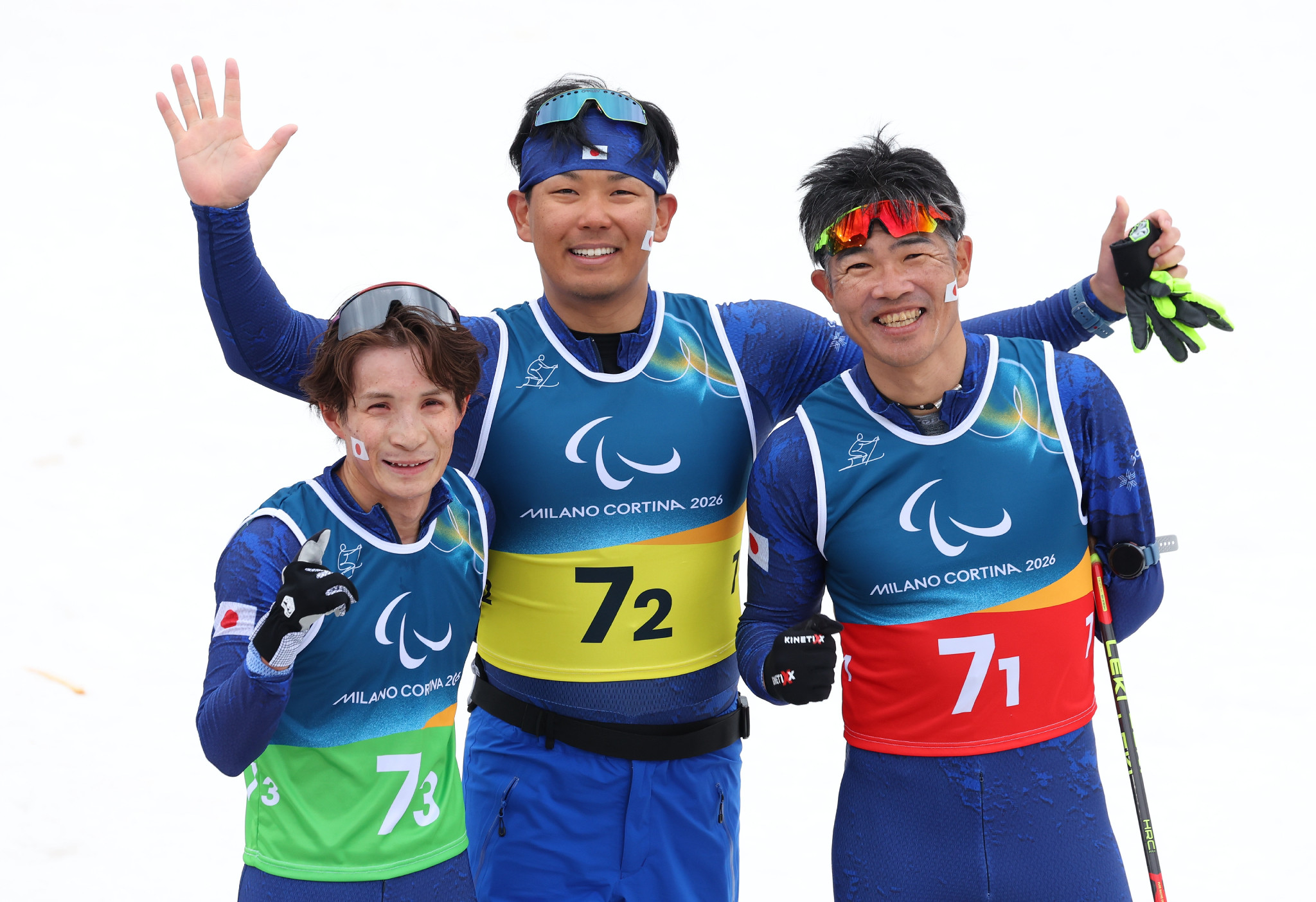 ミラノ・コルティナ・パラリンピック。ノルディックスキー距離混合オープン10キロリレーを終えた日本チームの(左から)川除大輝、森宏明、新田佳浩=14日、テーゼロ