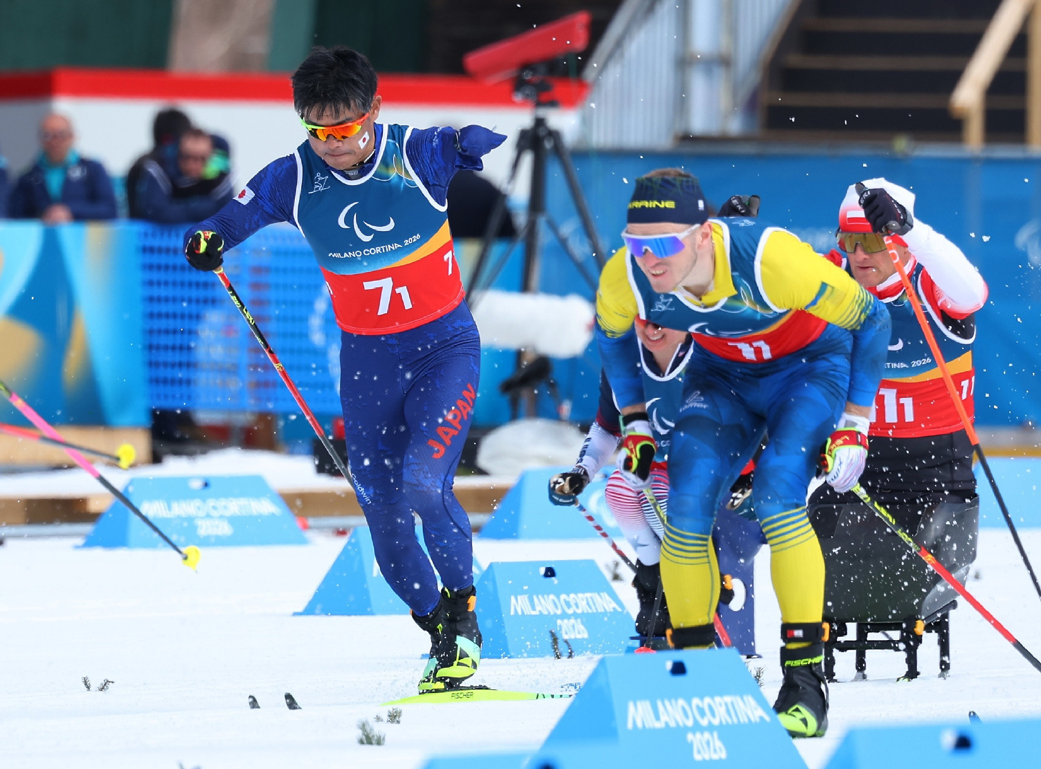 ミラノ・コルティナ・パラリンピック。ノルディックスキー距離混合オープン10キロリレー、スタートする第1走者の新田佳浩(左)=14日、テーゼロ
