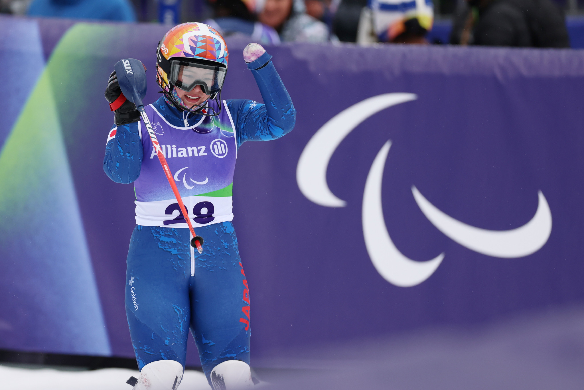 ミラノ・コルティナ・パラリンピック。アルペンスキー女子回転立位、2回目の滑走を終えて手を振る本堂杏実=14日、コルティナダンペッツォ