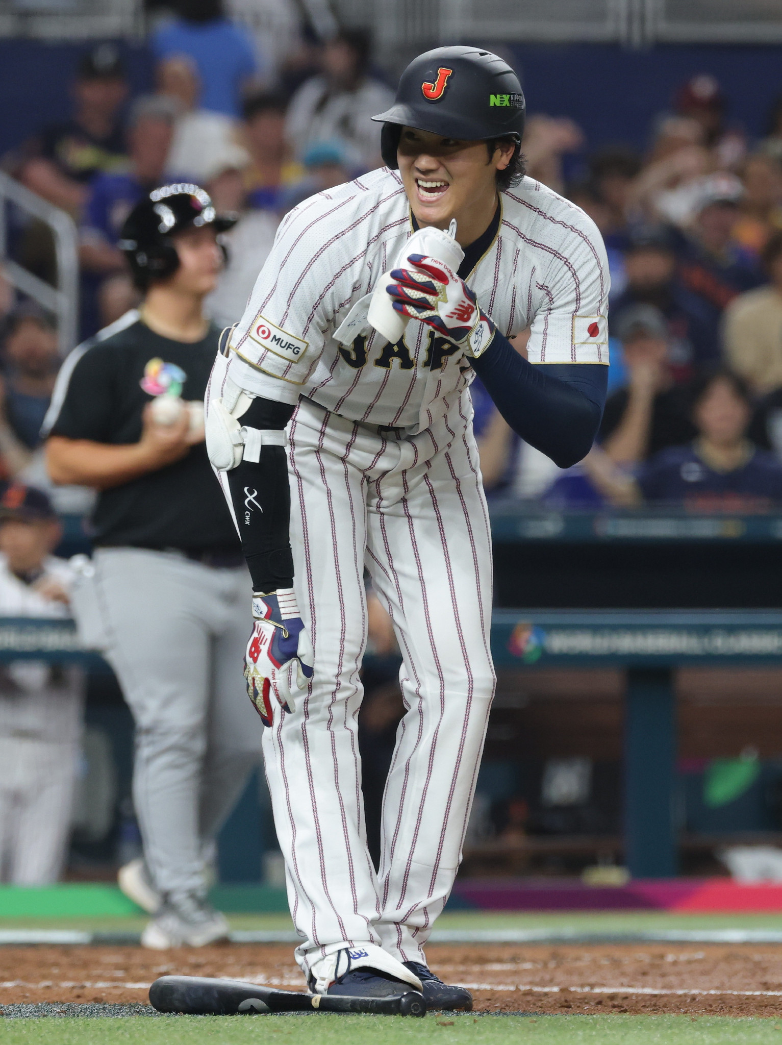 WBC・日本―ベネズエラ。3回、申告敬遠で出塁する日本代表の大谷=14日、米フロリダ州マイアミ