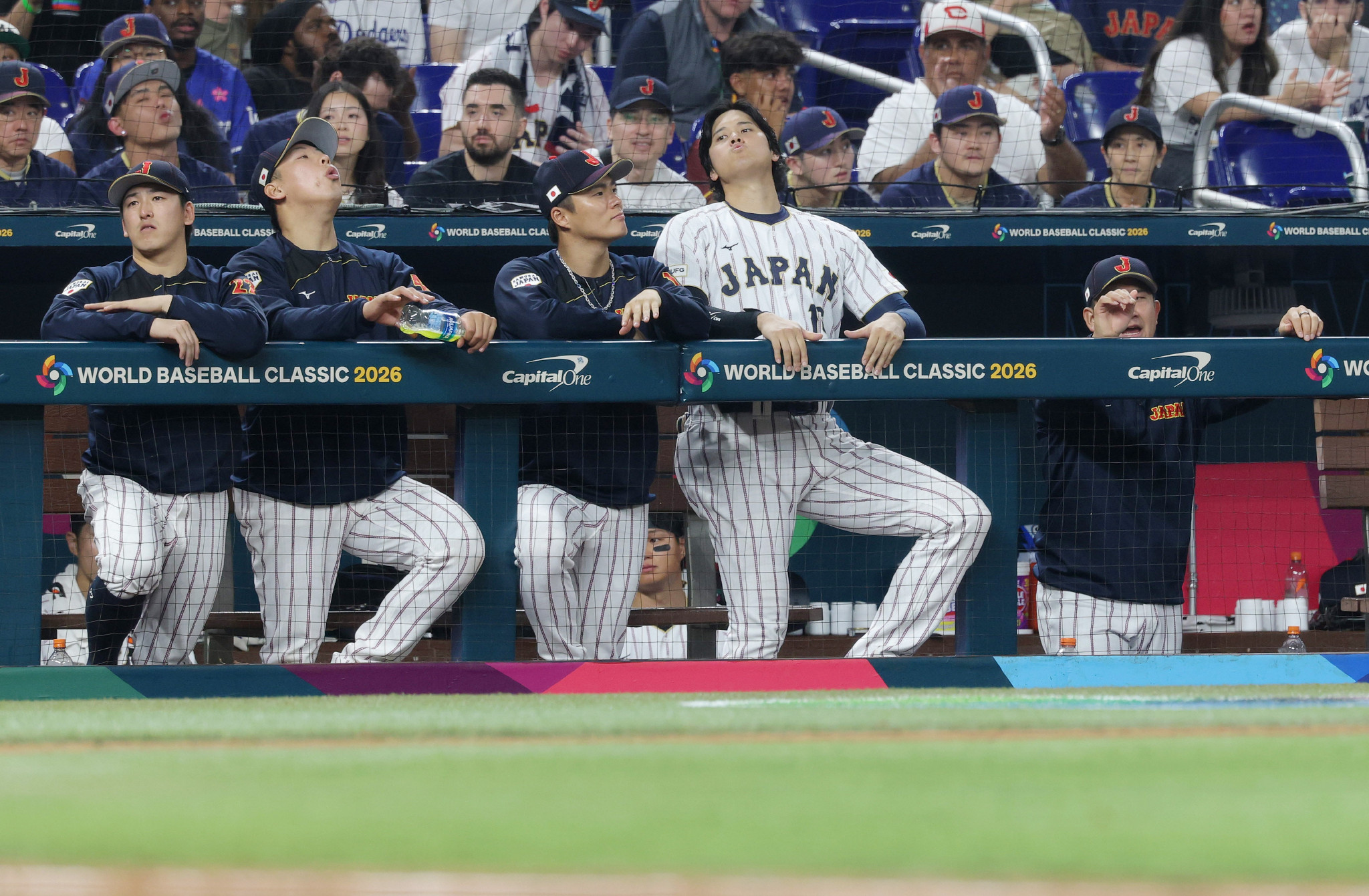 WBC・日本―ベネズエラ。8回、試合を見詰める日本代表の大谷(右から2人目)ら=14日、米フロリダ州マイアミ