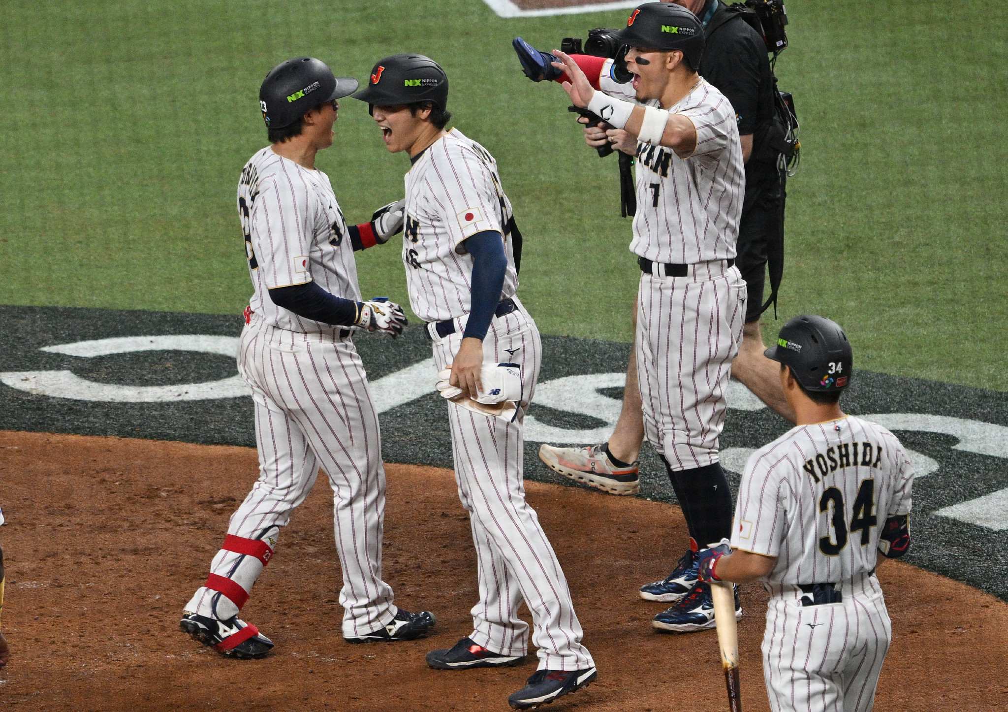 WBC・日本―ベネズエラ。3回、3ランを放ち生還した森下(左)を迎える日本代表の大谷(中央左)ら=14日、米フロリダ州マイアミ