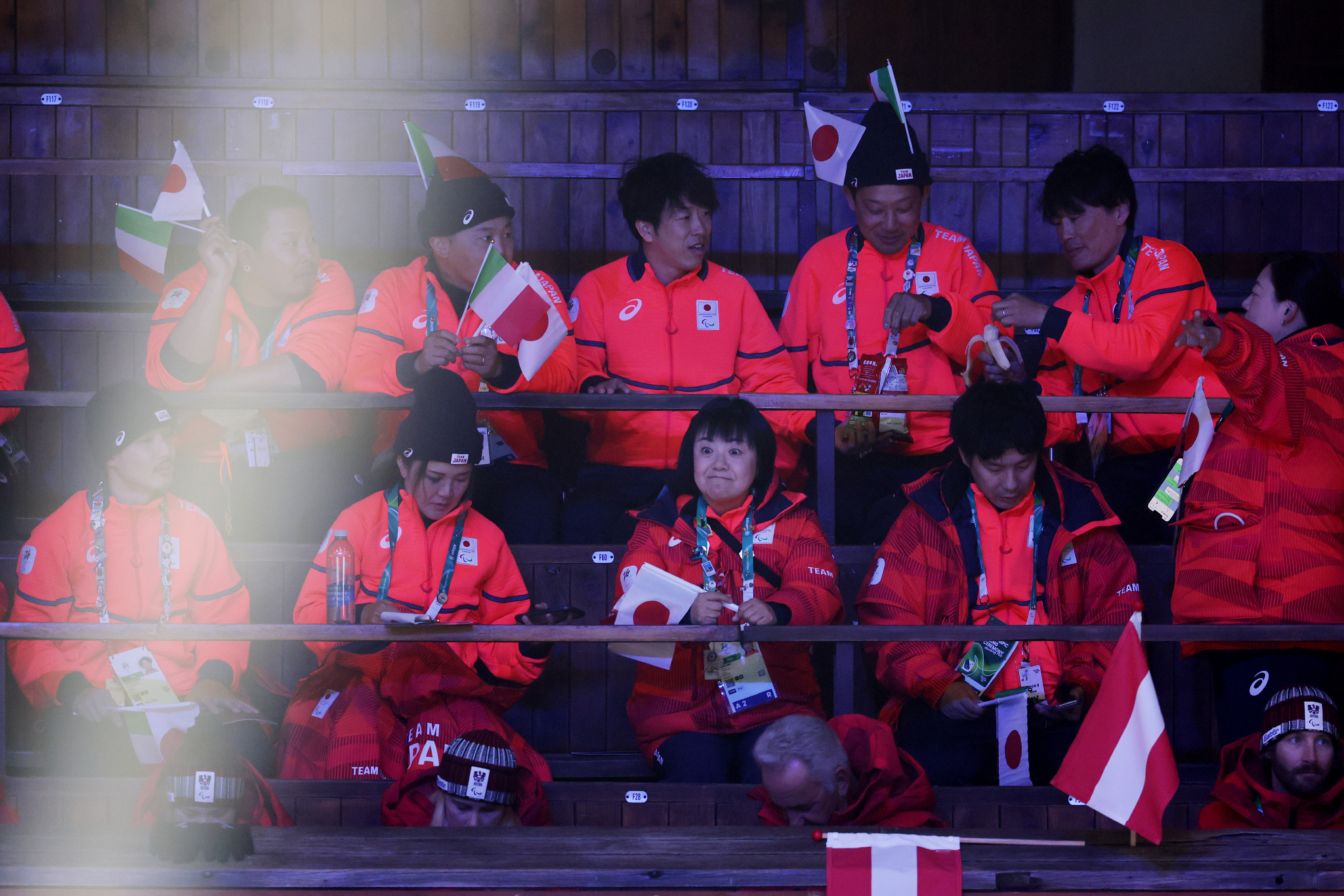 ミラノ・コルティナ・パラリンピック。閉会式に臨む日本選手団=15日、コルティナダンペッツォ