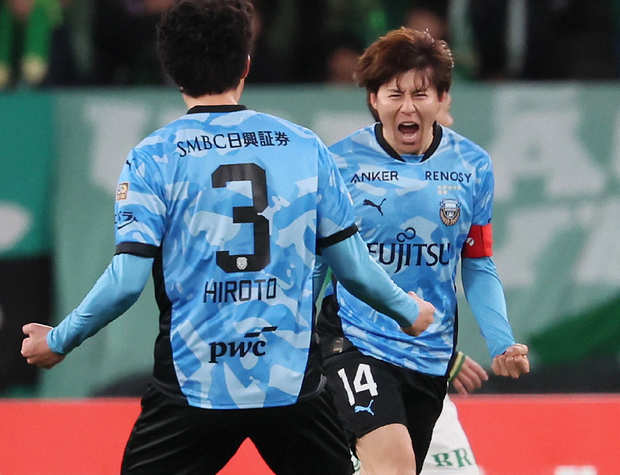 東京V―川崎。前半、先制ゴールを決め、喜ぶ川崎の脇坂(右)=18日、味スタ