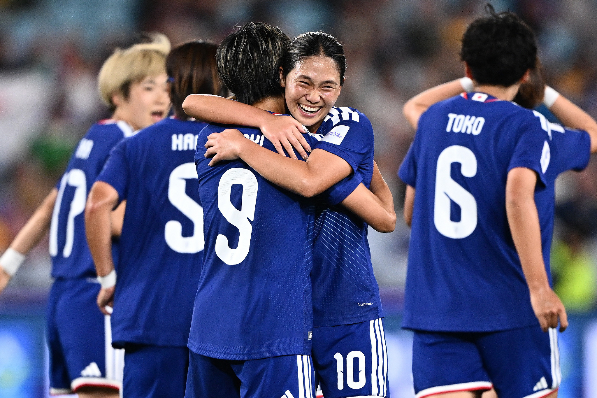 サッカー女子アジア杯。韓国戦で先制点を喜び合う長野(中央右)と植木(中央左)=18日、オーストラリア・シドニー